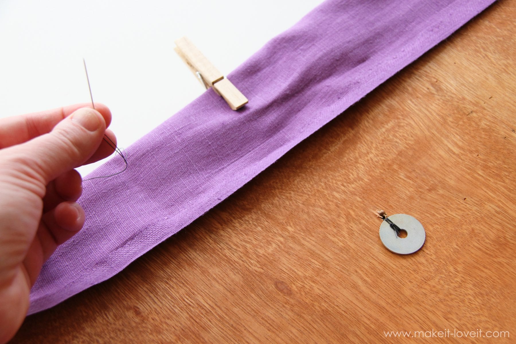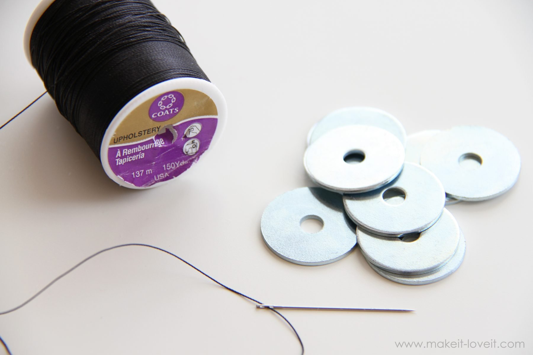 Now, you’ll need some supplies. Some upholstery thread (which is thick and super strong) and some large flat washers.