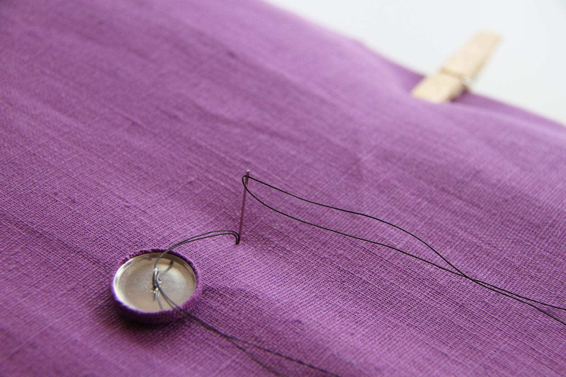 Then from the front, thread the needle through one of the Cover Buttons and then poke the needle back through the fabric. But not exactly through the same spot you poked it through, skip a little of the fabric so the thread will have something to hold onto after you pull it through. Then continue to push the needle through, trying to make it through the hole in the wood.