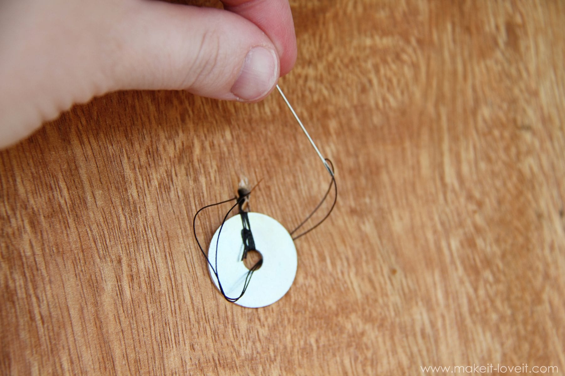 Next, thread our needle with your upholstery thread and wrap the end through and around the washer a few times, then knot in place.