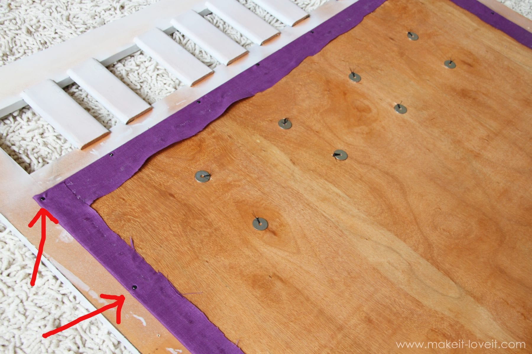 Then I placed a large piece of fabric over the batting and wood, about 3-4 inches wider on all sides. Then I folded the edges over and pinned them in place.