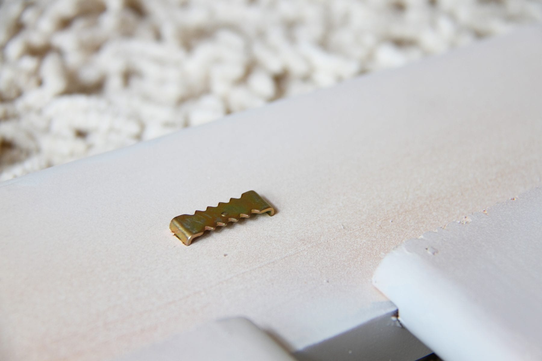 Now, if the headboard would have been the exact width as the metal bed frame, I could have screwed this headboard right to the bed frame. But the headboard is too wide. So to be sure that the headboard didn’t go anywhere, I attached picture frame hooks to the back of the headboard, right along the top. Any type would work, I just had these on hand…..so I hammered them in. Then I was able to anchor the top of the headboard to the wall with these hooks and then I pushed the bed up against the bottom half to keep it against the wall as well. Works great.