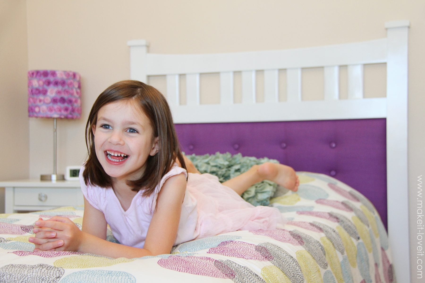 Ha….okay, not really. This headboard is a week or so old, so the excitement has worn off. I just asked her if she was excited to go the lake this weekend. :)
