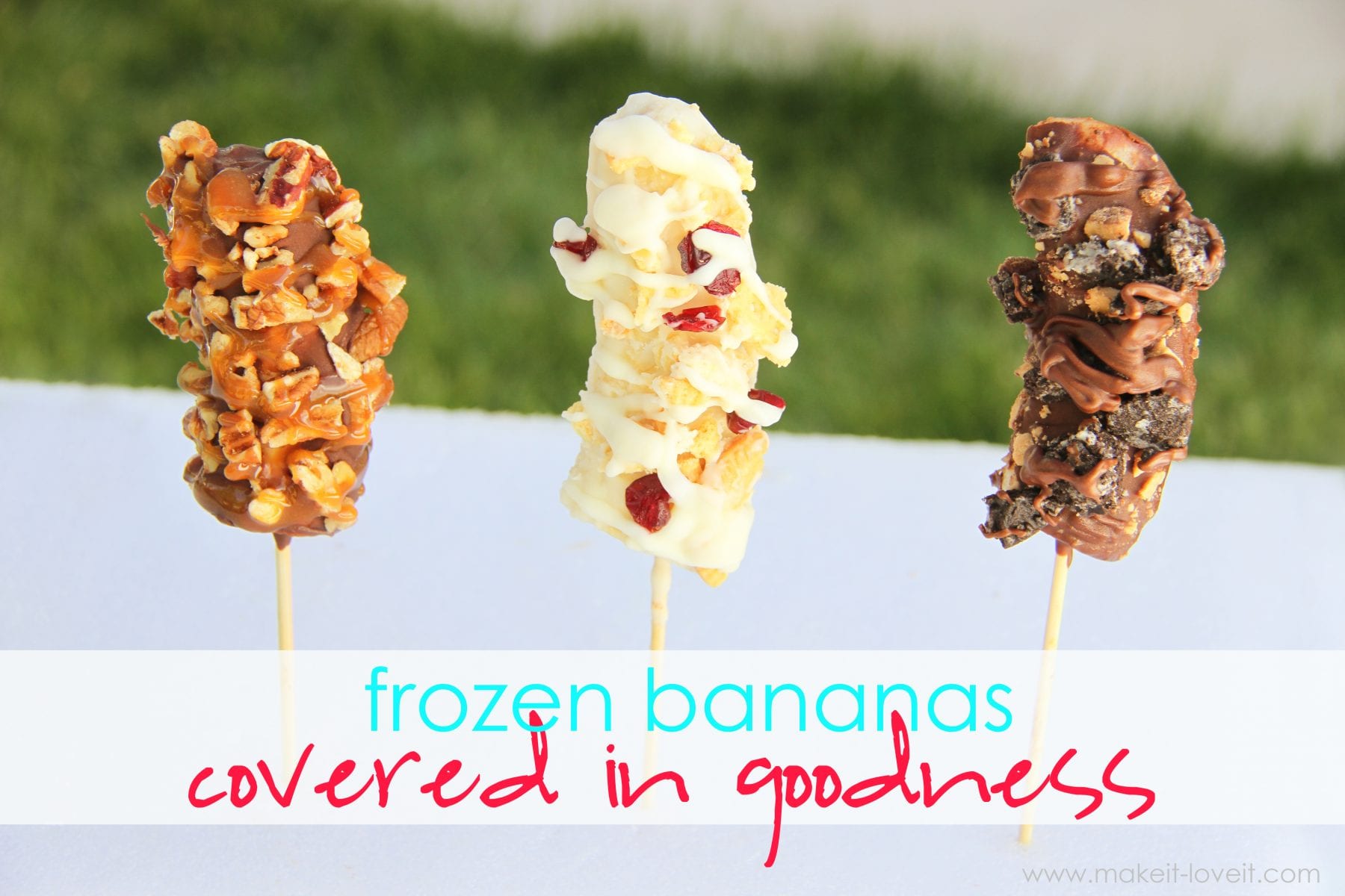 We have a BBQ grill, so everyone brought some meat to grill up, along with another sort of side to share.  I decided that we needed a little something other than salad, veggies, chips and dips.  So when I was flipping through a grilling magazine the other day that I bought at the checkout counter at the grocery store last week (the placement of those checkout stand products are so tricky……..they entice me all the time), I found some great looking frozen bananas, covered in all sorts of chocolate and other delicious bits of goodness.  And because I really like bananas and, well, am in love with chocolate……..and the two of those together automatically puts me in a happy mood, I figured it would be a delicious sweet treat to share.