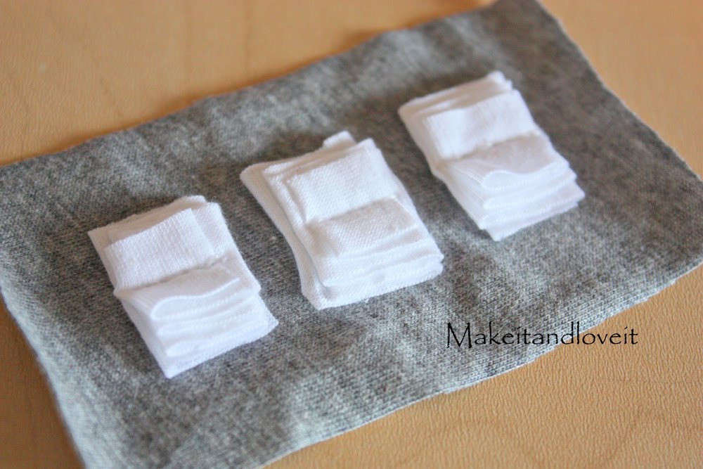 I used scrap knit for all of the pieces. The biggest piece is about 3.5 x 12 inches. The grey rectangle is 2.25 x 4 inches. And the white strips are 4.5 inches long and about 1 inch wide at one end and about 1/2 inch at the other.