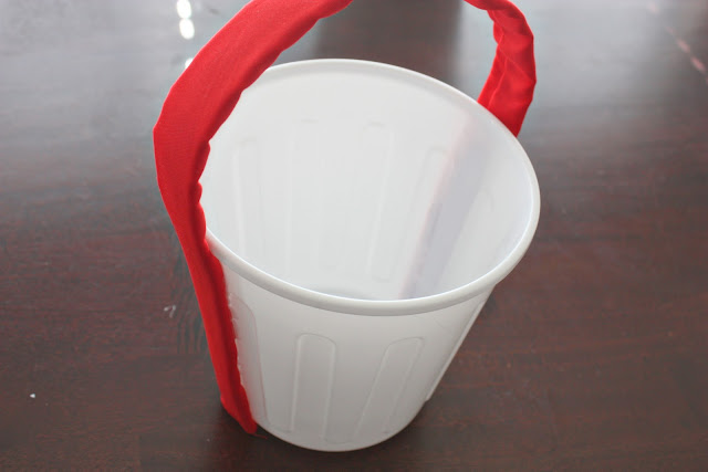 First, take a look at the $1 store or Target/Wal-Mart for a little bucket…..whatever size you’d like.  Look for one that is pretty straight up and down, not round shaped at all (like the pumpkin buckets), and without too many contours on the surface.  And if you can find one with a handle, even better.  But I couldn’t.