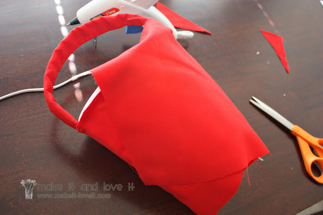 Tip: When gluing fabric to plastic, make sure you are using a hot enough setting on your glue gun.  Sometimes I get questions about the glue peeling off of plastic objects……but I rarely have problems with my dual setting hot glue gun, that I bought for $10 at Wal-Mart.  If I need an extra boost of heat, I just switch to the hottest setting and it always helps things stick even better.