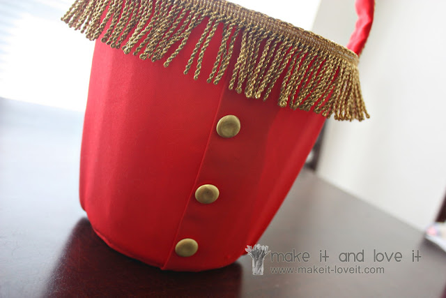 Then I added more of that gold fringe (that I used on the Prince Charming costume) around the top of the bucket.  This hid all of the edges and imperfections really nicely.