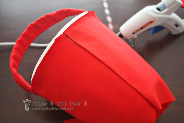 Tip: When gluing fabric to plastic, make sure you are using a hot enough setting on your glue gun. Sometimes I get questions about the glue peeling off of plastic objects……but I rarely have problems with my dual setting hot glue gun, that I bought for $10 at Wal-Mart. If I need an extra boost of heat, I just switch to the hottest setting and it always helps things stick even better.
