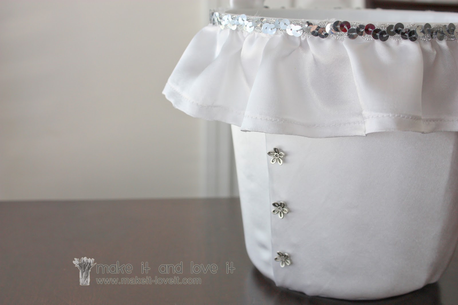 Then I adjusted the gathers until it wrapped around the top of the bucket and glued it in place.  I overlapped the ends just a bit, folding under the raw end of the piece that was on top.  That way you are hiding and tucking under all frayed edges.