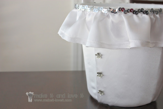 Then I added some sparkly trim (with hot glue) around the top to seal in all of the raw edges.  And then added some little metal flowers down the front folded seam.