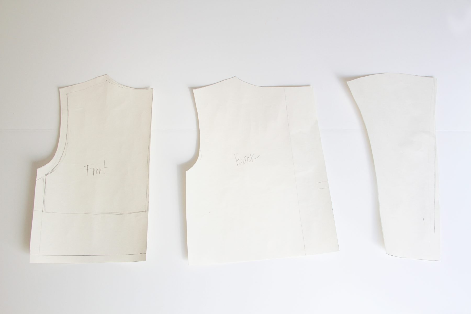 Then I created pattern pieces for the inner satin layer. I took the seam allowance away for the arm holes (because I use bias tape around the openings later on), gave the neck a bigger scoop, and made the width of the shoulders more narrow.