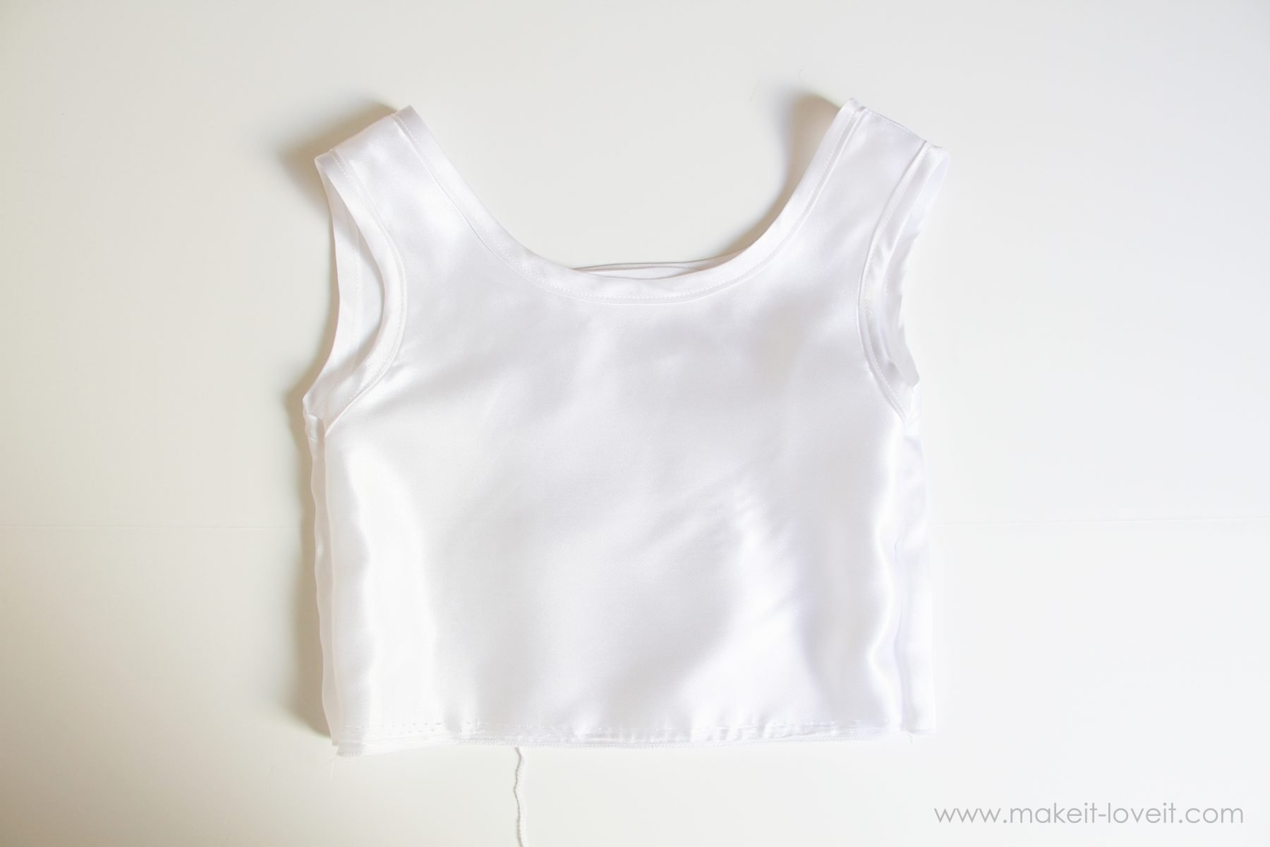 Then sew the satin lining pieces together at the sides and shoulders and then make some bias tape out of the same satin fabric and sew that around the arm holes and neckline. (More on Bias Tape here.)
