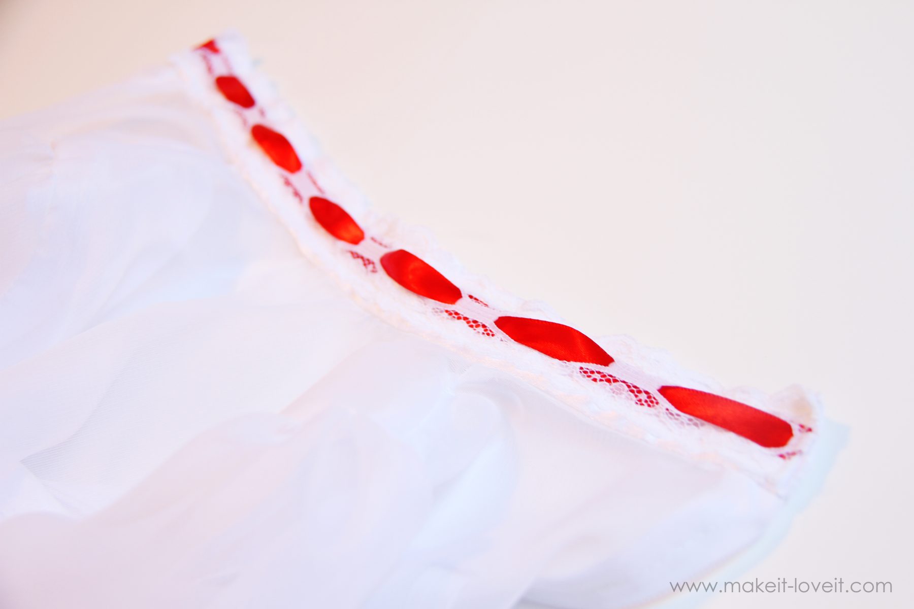 Now, grab your lace with the holes down the center and thread your red ribbon in and out of those holes until you have a piece long enough for the collar.