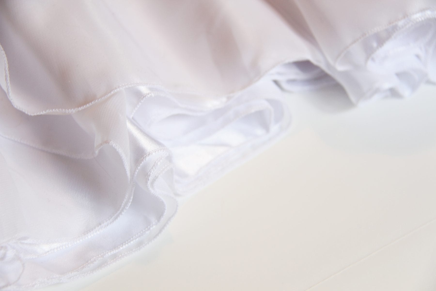 Now, cut 2 pieces of satin that are about twice as tall as the area on the bodice that you’re going to put them. Make one piece a little more narrow than the other one so that when you stack them, you will see both. Then serge or hem each raw edge. (My serged pieces are 5.5 x 12 inches and 4 x 12 inches.) Now, add a piece of ruffled lace to each long edge, allowing the lace to go about a 1/2 inch off the edge of the fabric.