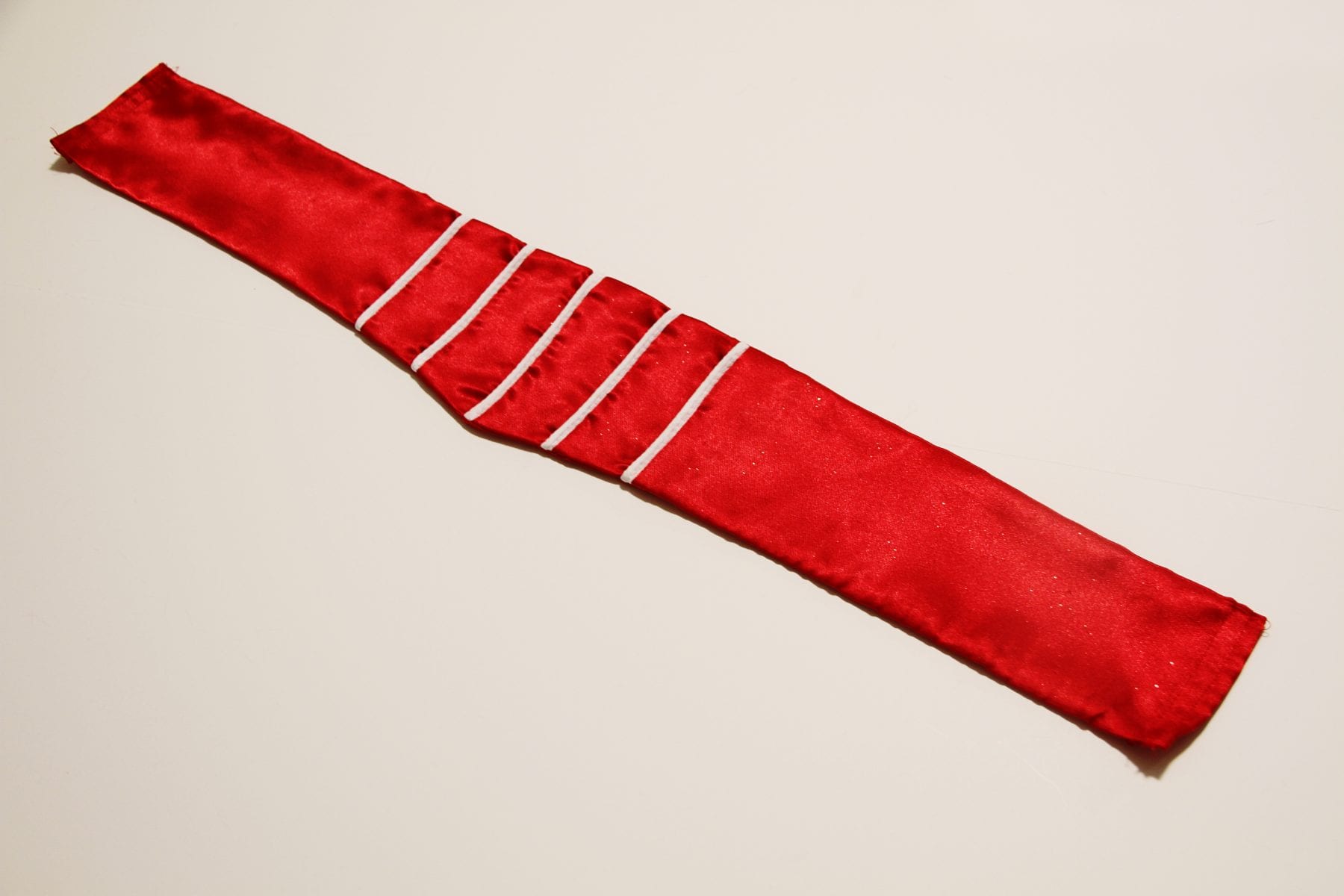 (Okay, this really bothers me so I have to explain about all the puckering. I changed the tension on my machine while gathering the skirt section in previous steps and then forgot about it. So when I sewed this up, it really puckered but I just thought the piping and satin together were being finicky. So I ironed it like crazy to try and flatten out all the puckers but they wouldn’t come out completely. And then, I realized why it had puckered………but I didn’t have enough of the red satin to make another one. Bummer. It’s not as noticeable when it’s on the dress. Whew.)