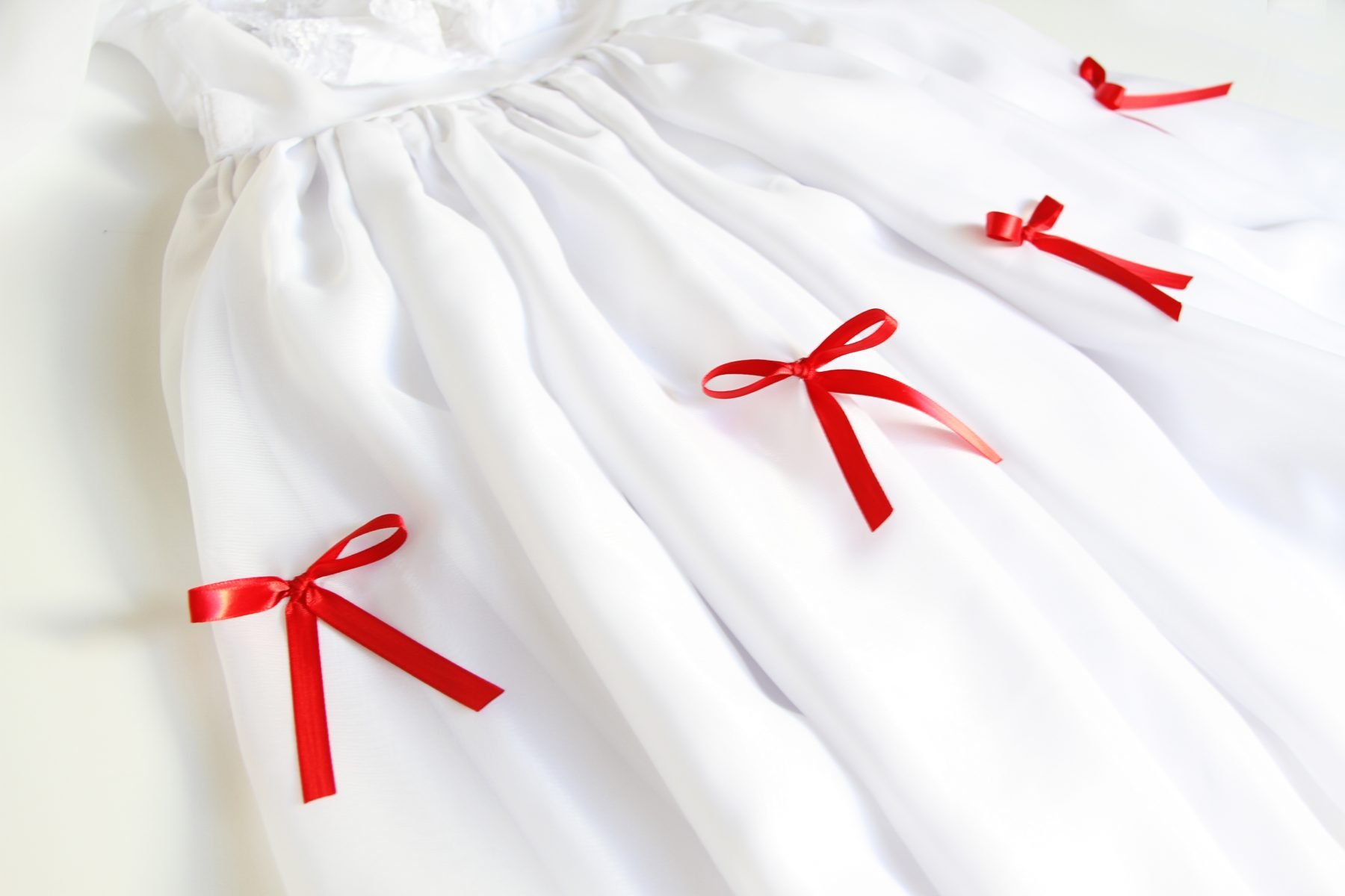 Then add some red ribbon bows to the outside of the skirt (about half way down) by hand stitching them in place. (I used 8 bows all the way around.)