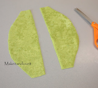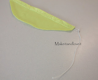 Now, you’re going to create 2 flutter sleeves. Here is the basic shape of each sleeve. I needed sleeves that were 6 inches long (not width). But I made them 10 inches long to allow for gathering. At its widest point, they are about 3 inches wide.