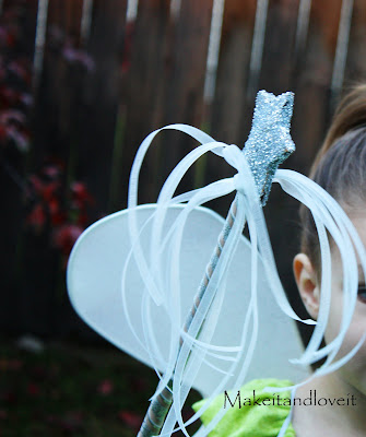 And I forgot to take pictures as I was making the wand. But I made it by gluing 2 cardboard stars to one end of a wooden dowel…..hiding the end of the wooden dowel between the two pieces of the stars. Use plenty of glue and press the stars together firmly. Then I coated the star in elmer’s glue and sprinkled plenty of glitter over it. Then I wrapped the wooden dowel with some sparkly ribbon. And then tied some sheer ribbon around the top, right under the star. All part of the magic!!