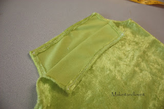 Pin in place and sew several time along the front and back corners of the costume. Repeat with the other shoulder. (I didn’t hem the other edge of the sleeve because this fabric is knit and doesn’t fray.)