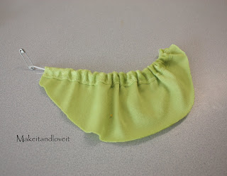 Then make a casing for the elastic by turning under the long straight edge, about a half inch. Then thread a piece of narrow elastic through the casing. (I needed my should strap to be 6 inches long, so I cut my elastic piece 6 inches long as well. After attaching the sleeve and using some for the seam allowance, it will be a little less than 6 inches. But this will allow for some stretch and will keep the sleeves up on the shoulders, perfectly in place.)