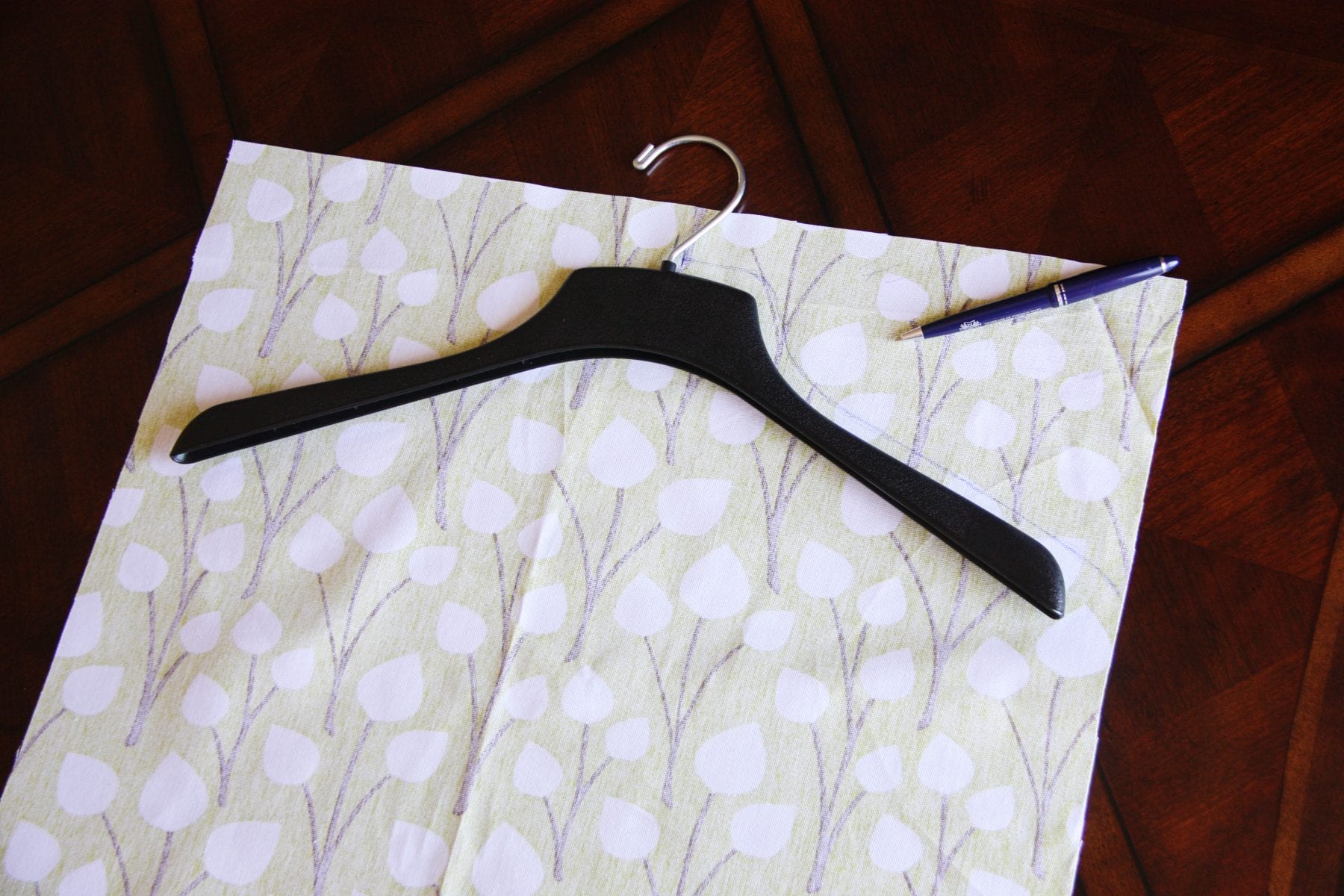 First, take one of your rectangle pieces (face down) and center your hanger along the top of your rectangle piece. Trace around the top contour of the hanger, about a 1/2 inch away from the hanger.