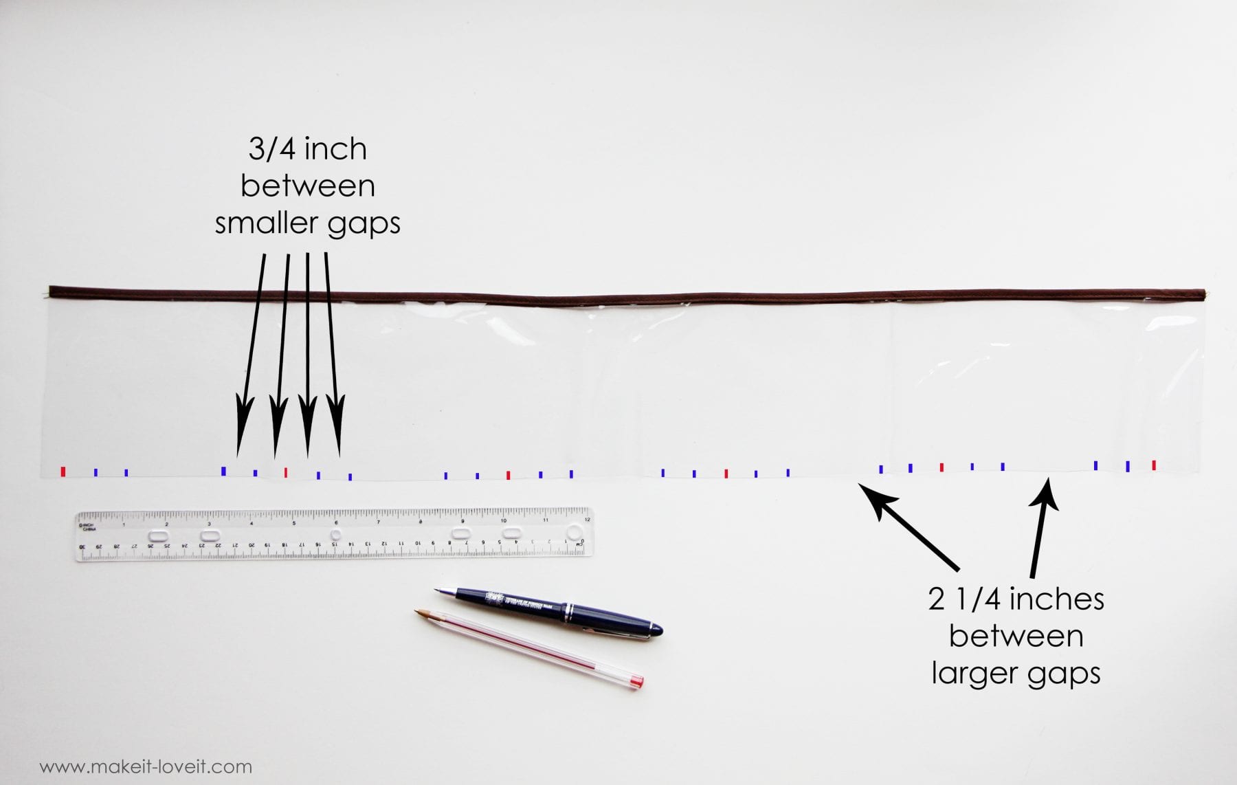 And to give the pockets some fullness (so that stuff will fit inside), I added 2 pleats to each pockets.  To do this, I started marking little lines along the bottom edge of the vinyl strips.  For the first 4 rows of pockets, I wanted each pocket to be about 3 3/4 inches apart.  And each pleat needed an extra 3/4 inch of length to fold with.  So I used a blue pen to mark my pleat lines and a red pen to separate my 2 pleats for each pocket.