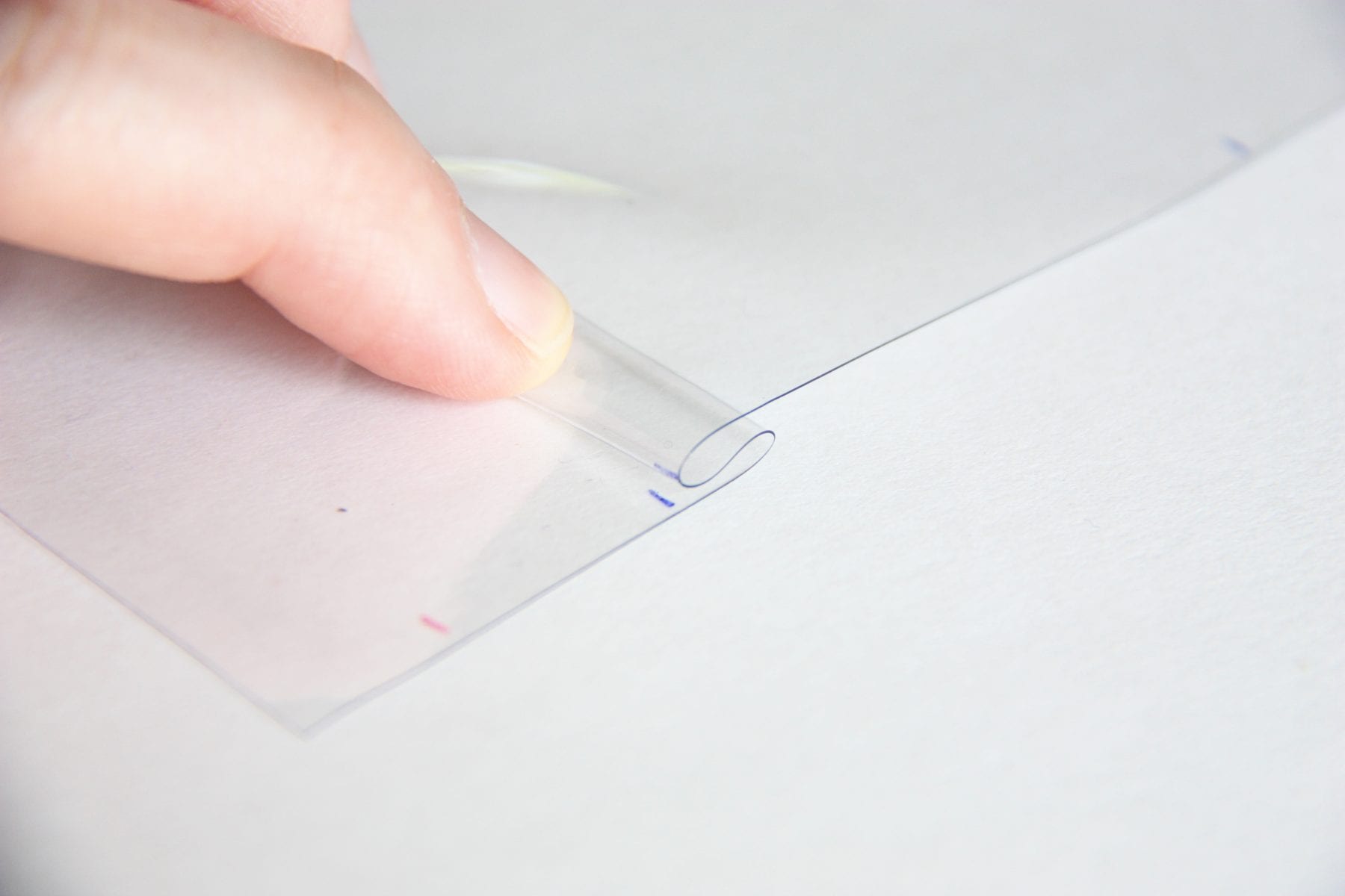 To make the 2 pleats for each pocket, you will make the left pleat fold over to the left…..and the right pleat fold over to the right.  Start on the very left of the vinyl and pinch the second blue line and fold the vinyl.