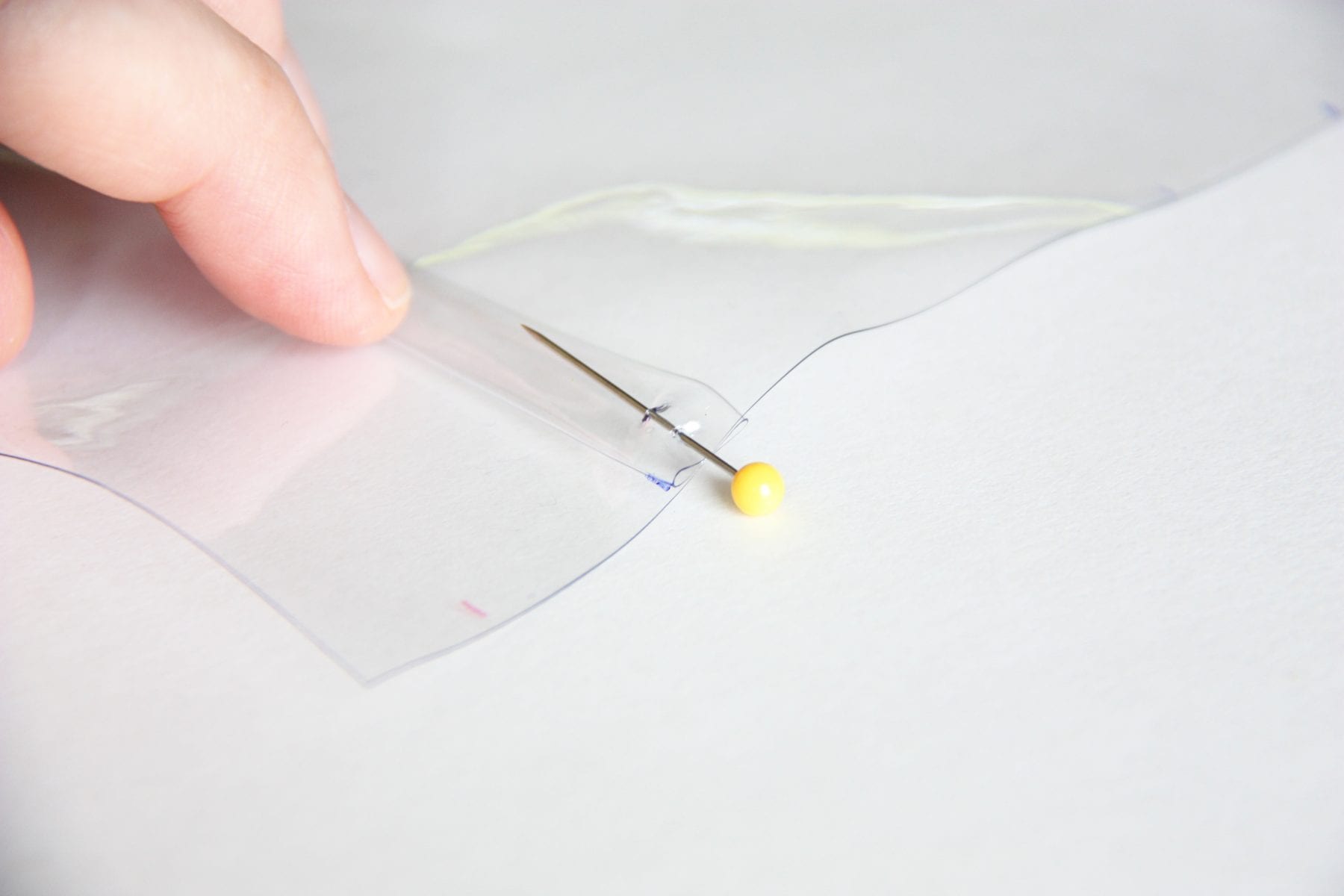 That makes your first pleat.  Now, pin it in place.  (Be sure to pin in the bottom 1/2 inch of the vinyl.  Because once you pull the pin out, you’ll have a small hole.  And the bottom 1/2 inch will be folded under so you won’t see those holes.  Anything above that, you’ll probably see at the bottom of your pocket.)