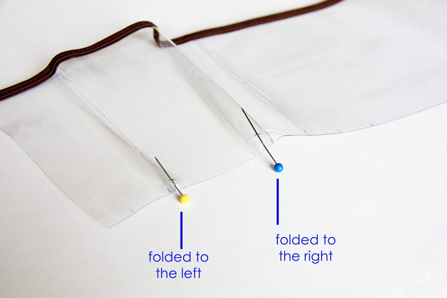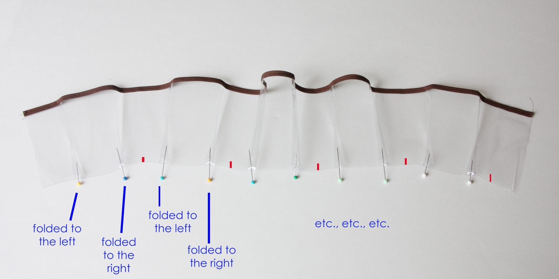 Now, continue along until you have all of the pleats folded and pinned.  Remember, the red lines are just the markers that will separate your pockets with seams later on.