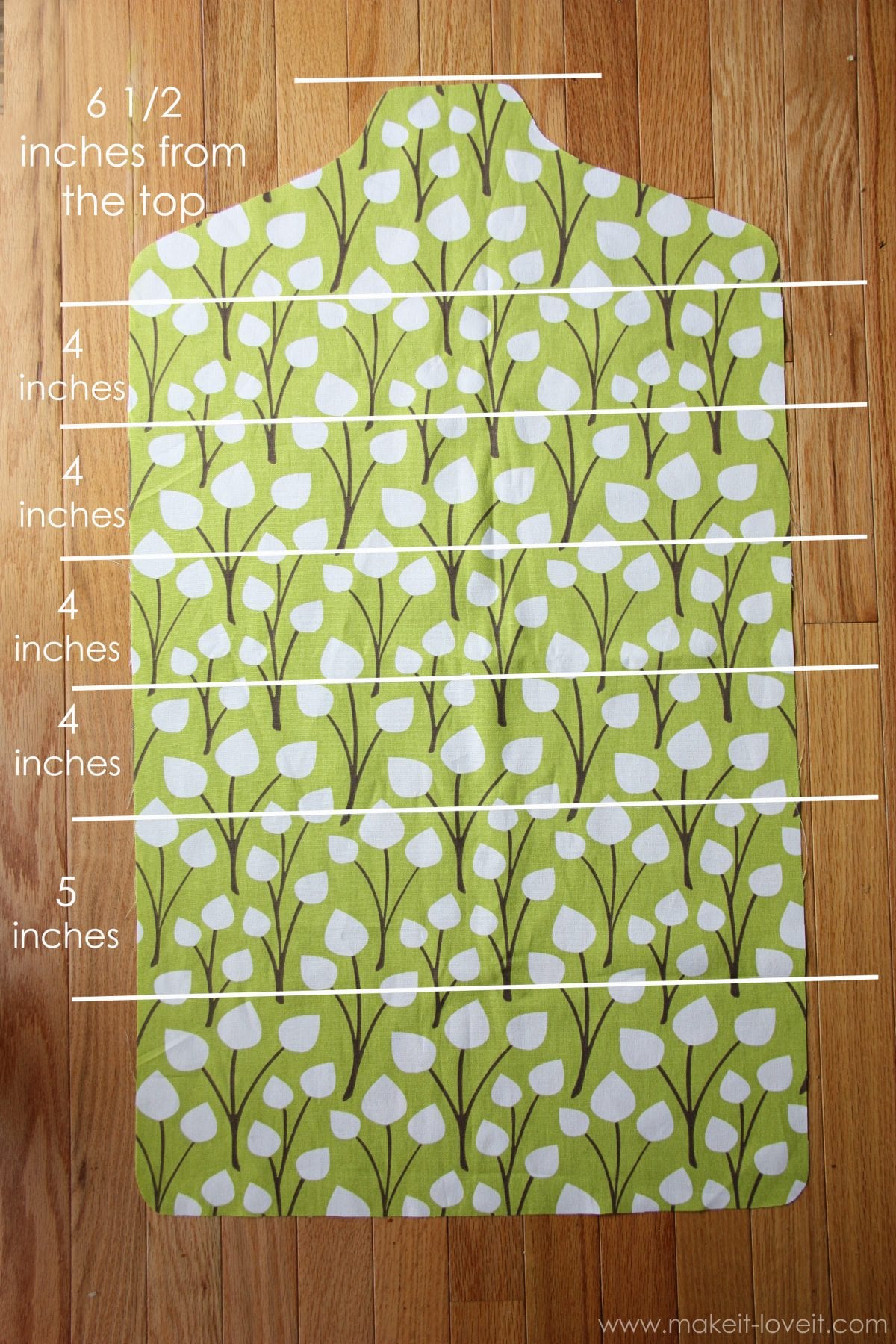 Then I started making chalk lines across the front side of one of my fabric pieces.  You couldn’t see the chalk lines very well in the picture, so I drew some white lines right on top, in photoshop.  So I measured 6.5 inches from the top and made my first line (where the very top of my first row of pockets will hit) and then measured down 4 inches made another line, etc.  These lines will be used to keep my rows of pockets even.  Then kept measuring down 4, 4, 4, then 5 inches.