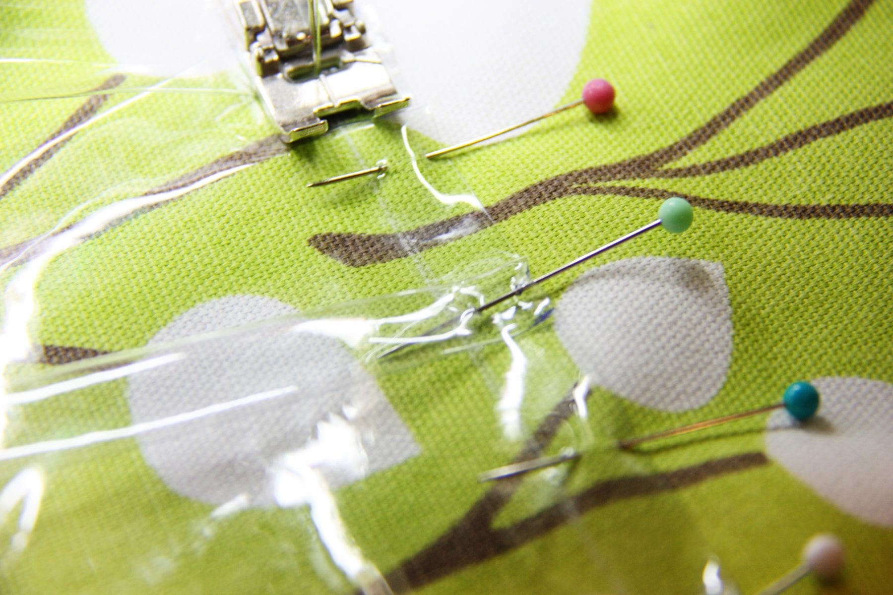 Then place under the sewing machine and sew the strip of vinyl in place, removing the pins as you go.  Sew right on top of that old chalk line as your guide.