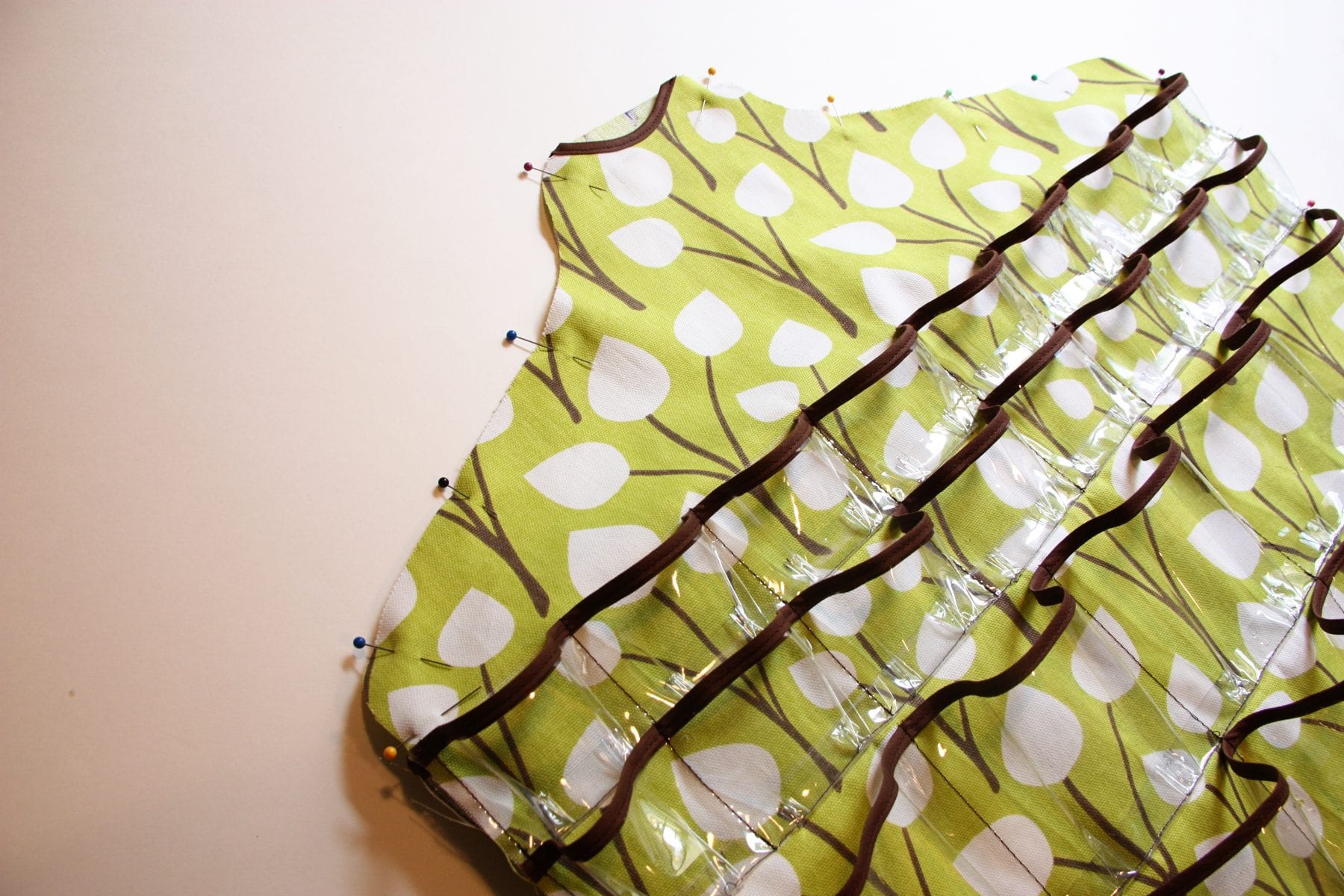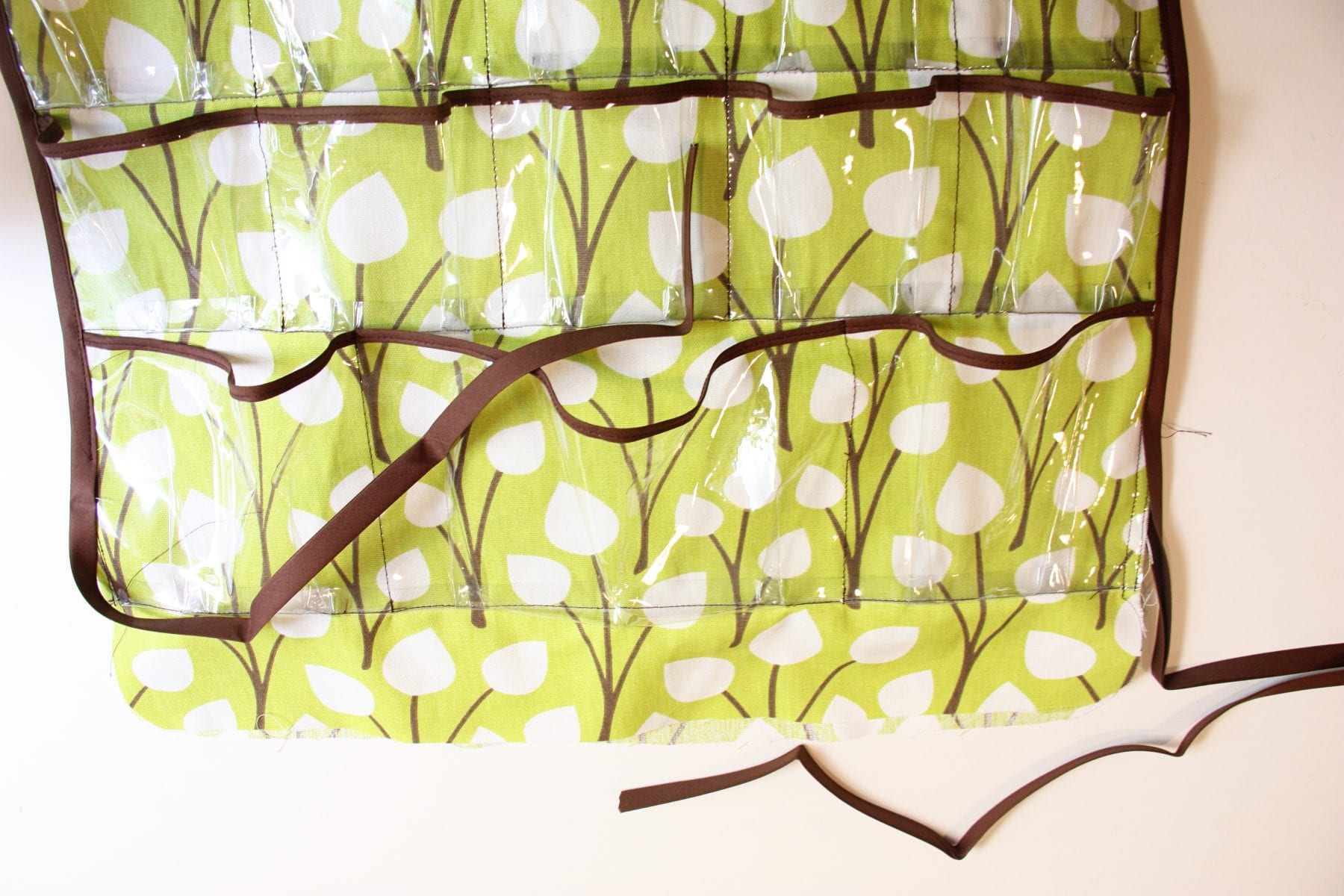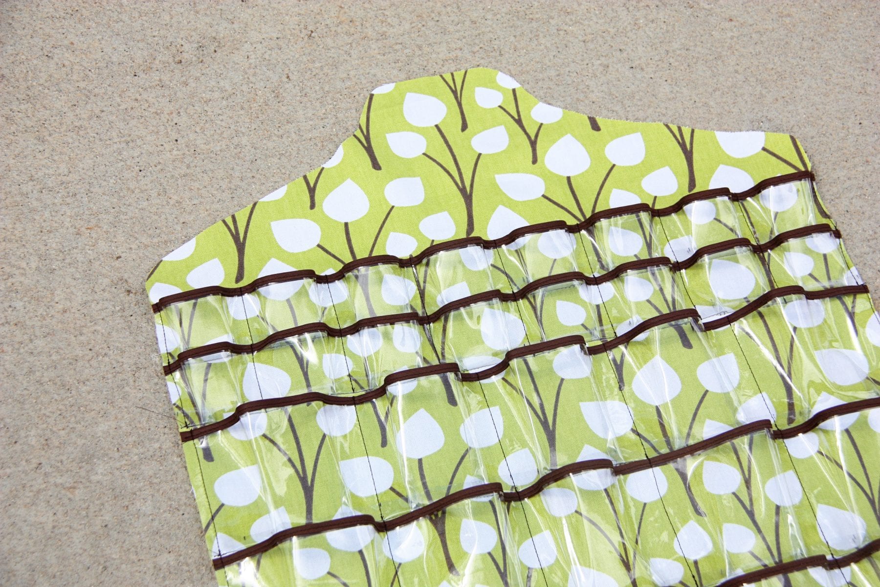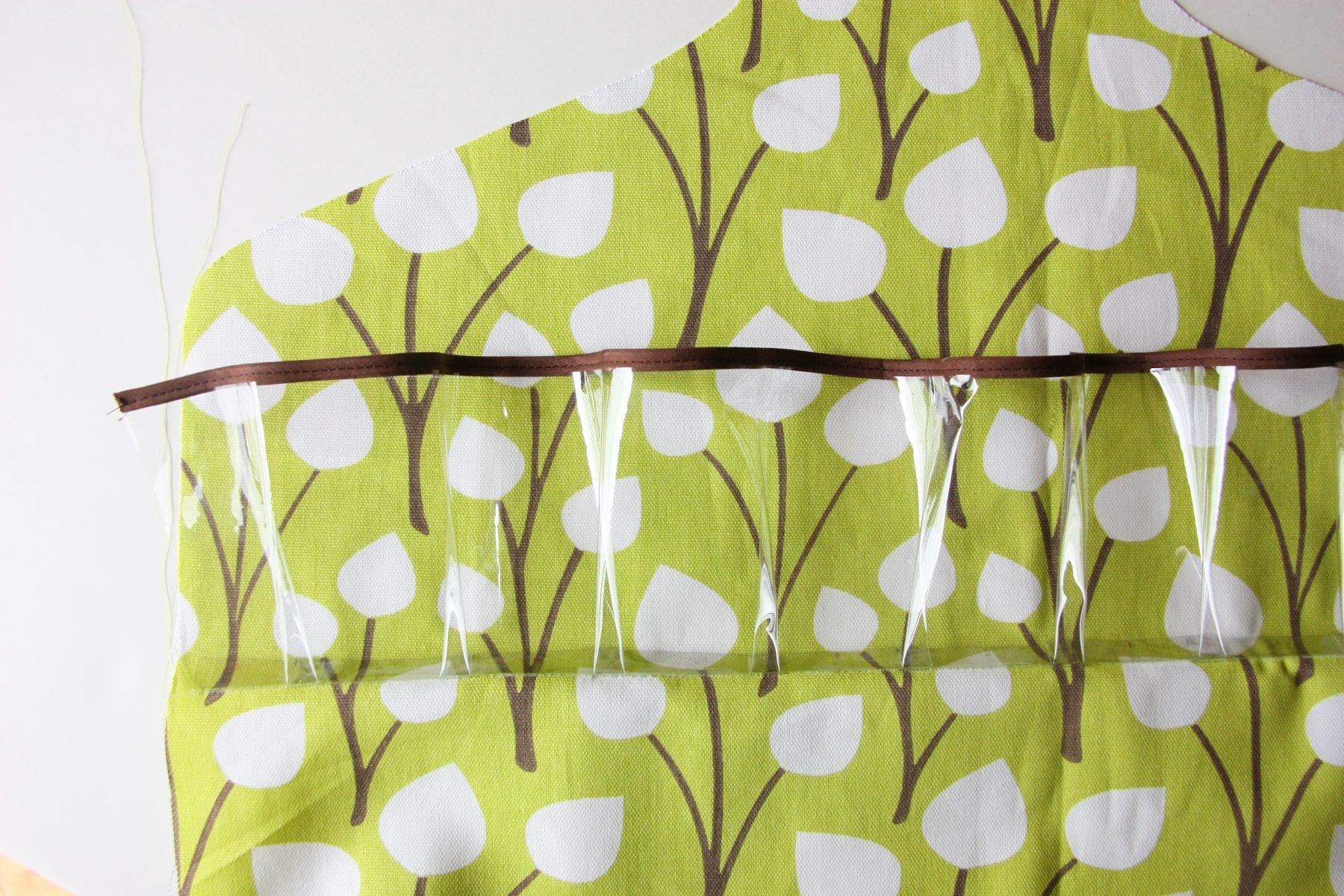 Now, you’ll need to decide on the size of your pockets.  And then sew 1/4 inch double fold bias tape to the top edge.  (What is bias tape?  Click here.)