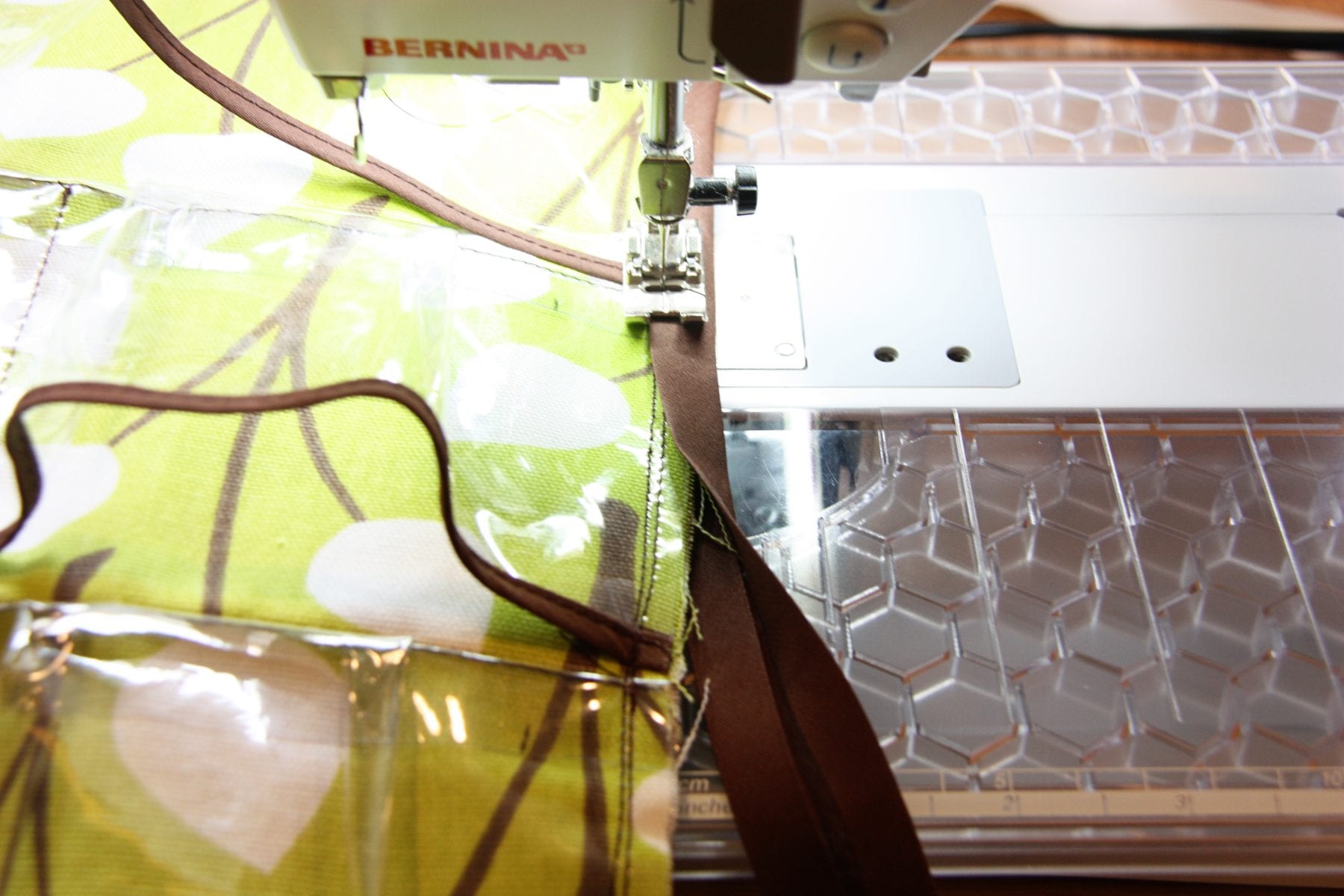 **TIP:  Sewing on vinyl can be tricky.  It tends to stick to your presser foot at times, and can keep your fabric from advancing.  To help this, you can place a layer of tissue paper between your foot and the vinyl and that will help it glide right along.  Then after, you can rip the tissue paper right off.  However, it makes it harder to see where you’re sewing.  So what I do, is increase my stitch length (from about a 2 to about a 3 or 3.5) to help jump over the vinyl a little bit more.  Also, I use both my hands on each side of the presser foot and pull the fabric and vinyl right along, so that the vinyl doesn’t get stuck.  I also, at times, put one hand in back of the presser foot and one in the front……and pull the fabric back that way.  Do what works best for you.