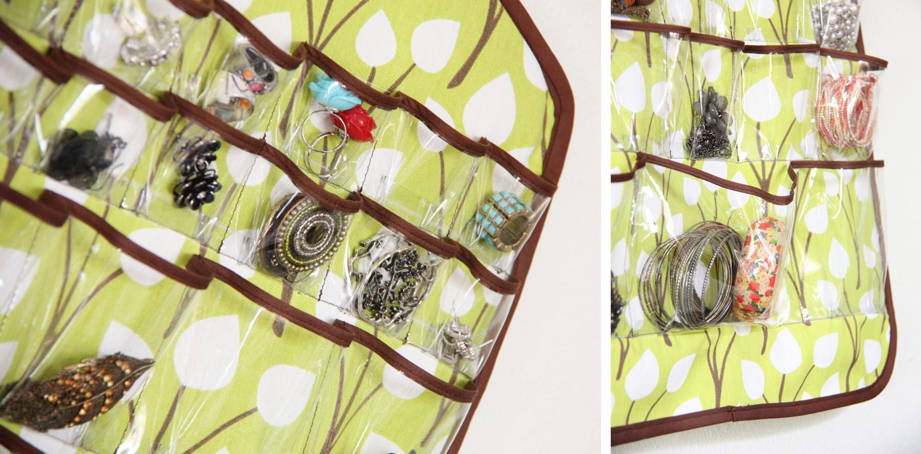 My rings and earrings fit perfectly in the smaller pockets and my bigger bracelets and necklaces slip right into the larger pockets.