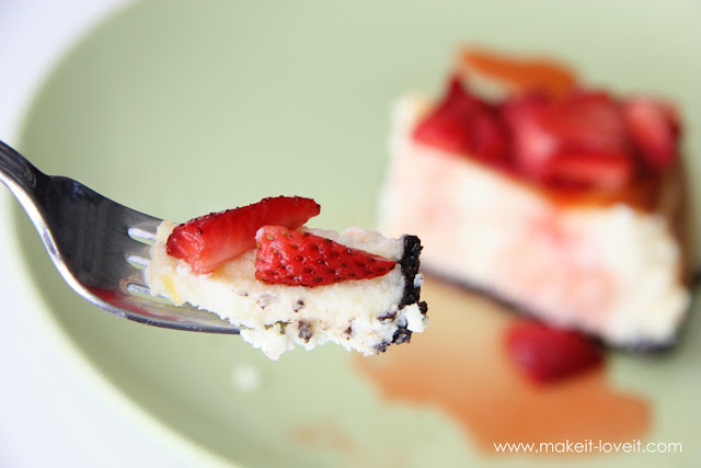 I used strawberries instead of raspberries and instead of graham crackers for the crust, I crushed up gluten free oreo cookie knock offs (without the filling).