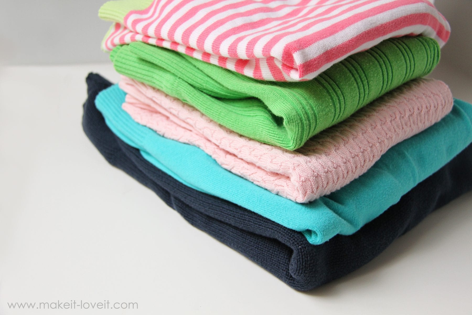 First of all, you need sweaters.  I have found that the best sweaters to use are the ones with ribbing along the bottom.  That will give you a nice snug brim for the hat.  Look in your closets, check out the hand-me-down pile, or look at your local thrift store.  There’s always an old sweater that needs a new life.