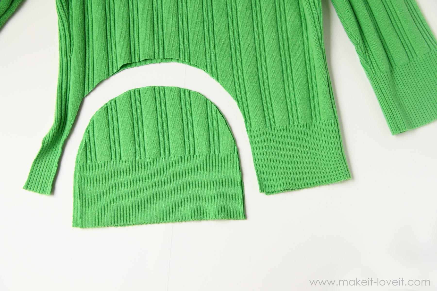 Then, line up the bottom edges of the sweater (the front and back) and then cut out a nice rounded hat shape.  Be sure that it’s tall enough to cover the head and then come down to cover the ears.  (Click here and here for other hat examples.)