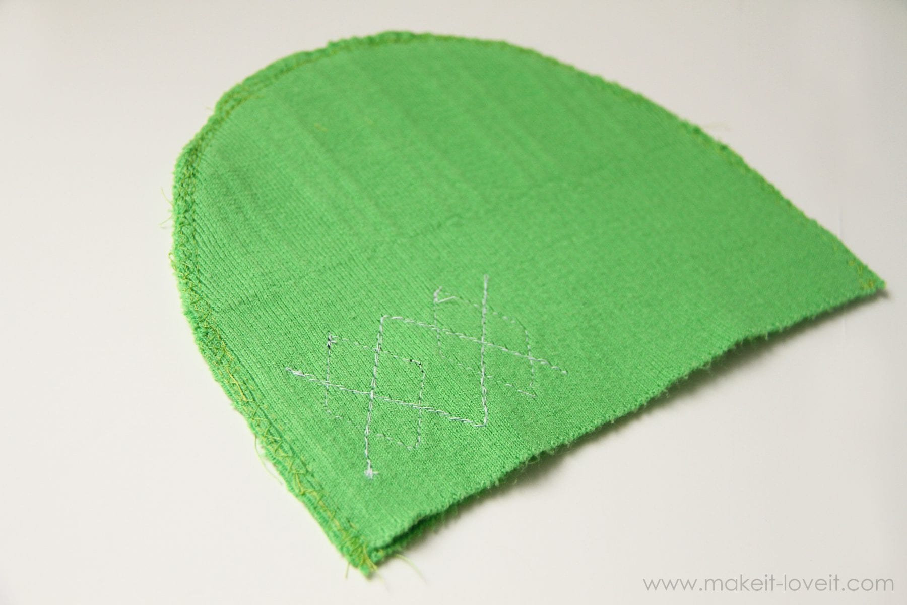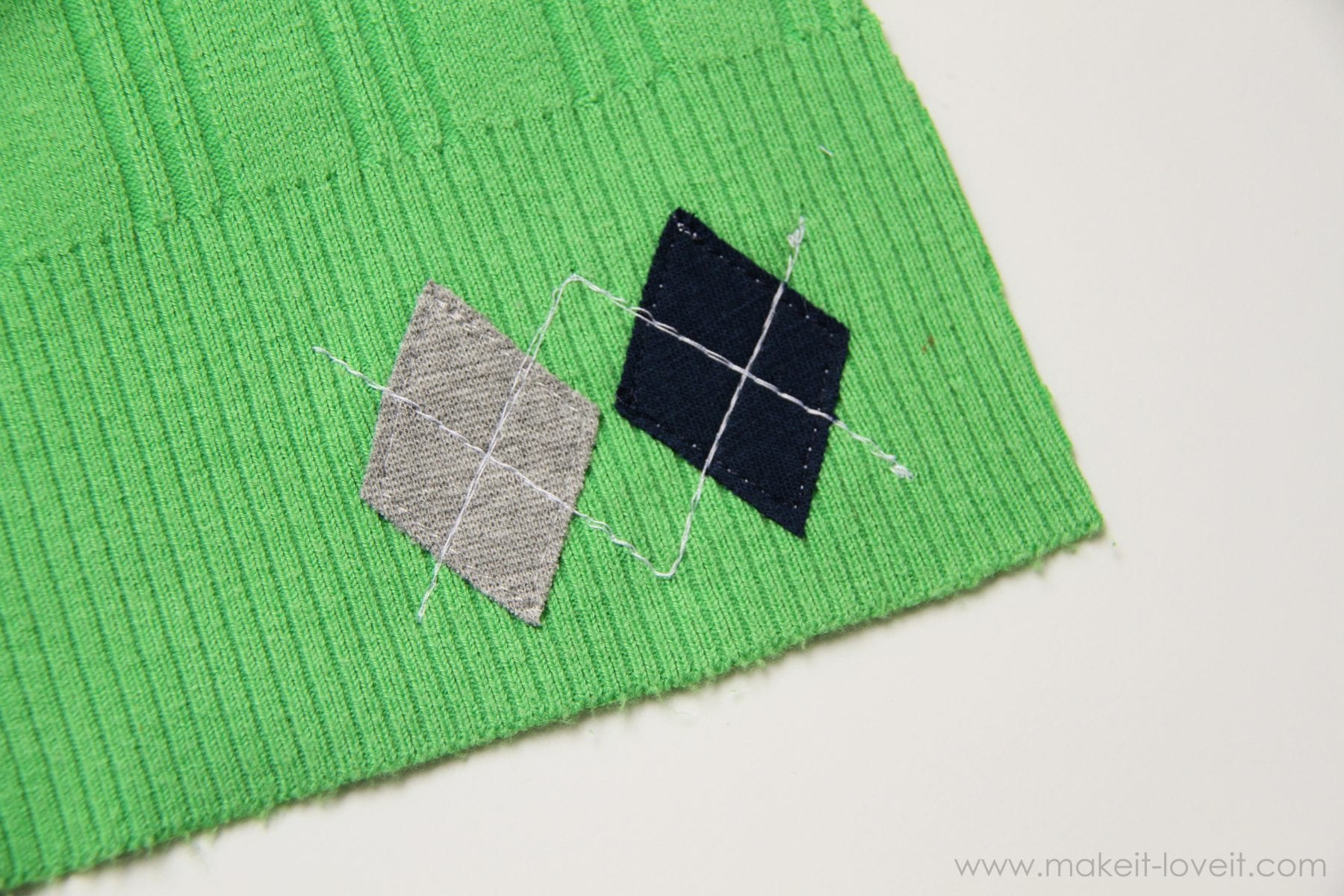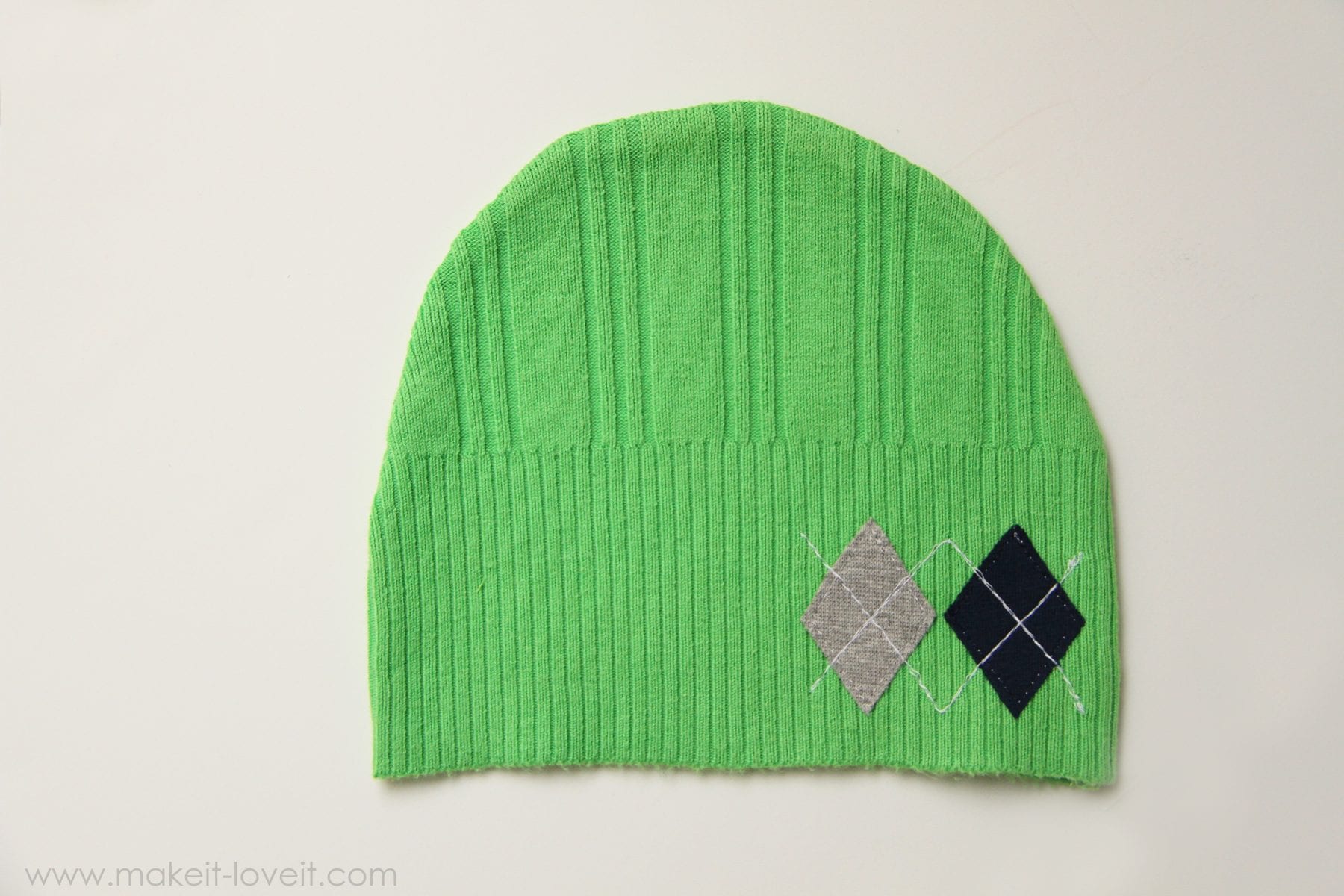 To make the argyle hat, cut two diamond shapes and iron some fusible adhesive onto the back (more help with that here).  Iron the diamonds down onto the front hat piece and then stitch around each diamond, attaching it to the sweater.  Then stitch a “V” shape and then an upside down “V” shape in another color……creating that argyle look.  I sewed the “V’s” two times each, to make them a bit bolder.
