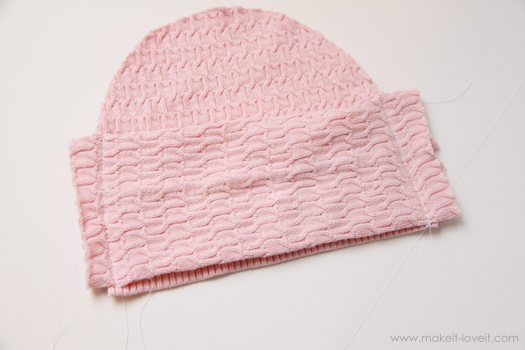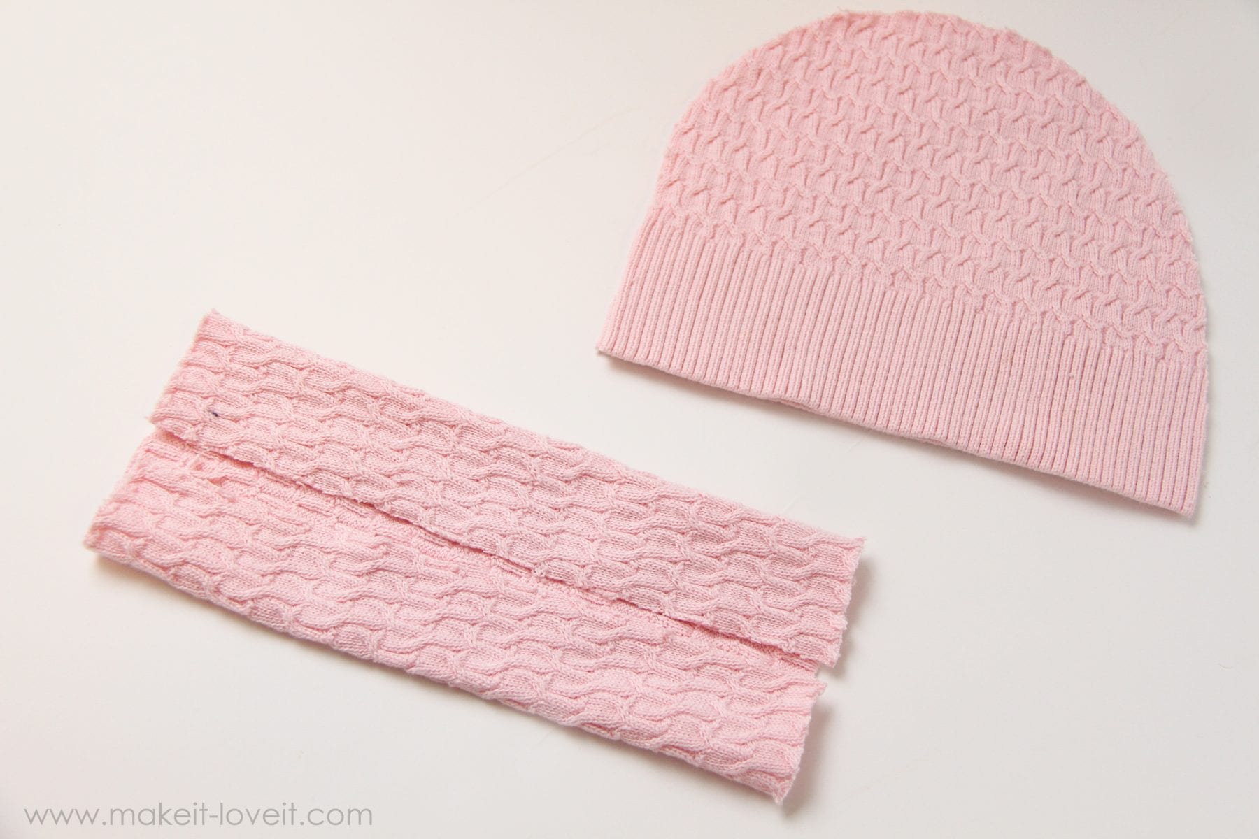 To make the pink hat with a bow, cut the hat pieces out the same way.  Then, cut another strip of the sweater that is just a bit wider than the hat pieces and then twice as tall as you’d like your bow to be.  Then fold the top and bottom edge of the strip towards the back.