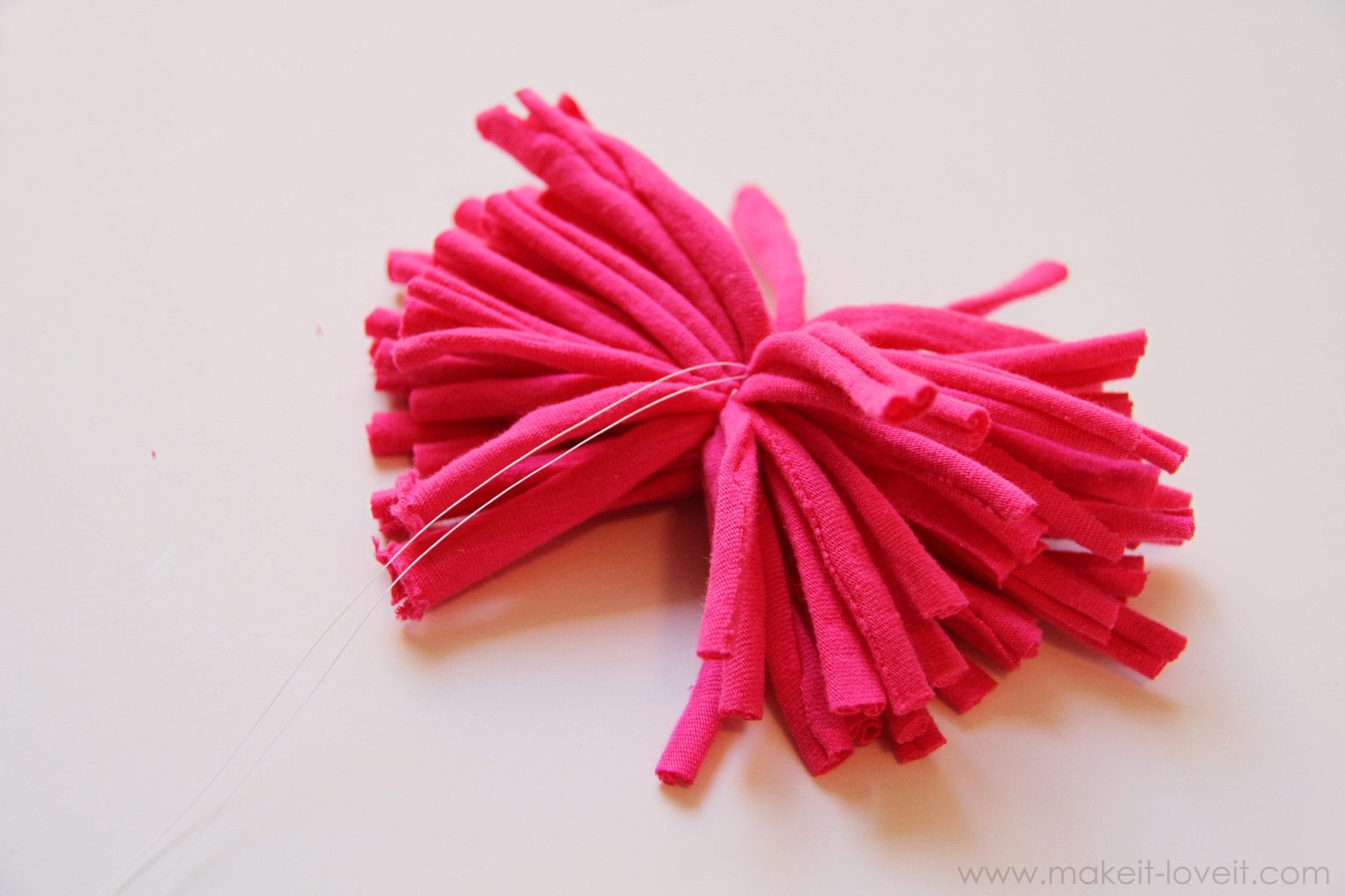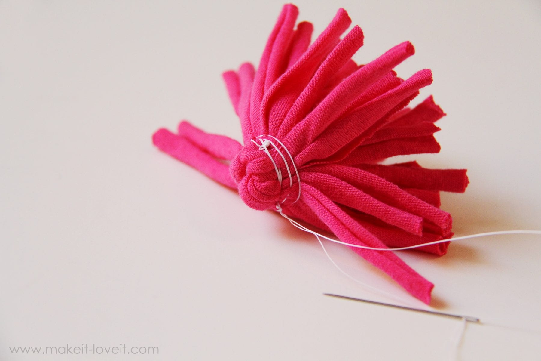 Then bend all the little pieces upward and then wrap thread around the bottom, forcing the little pom-pom pieces to sit upwards.
