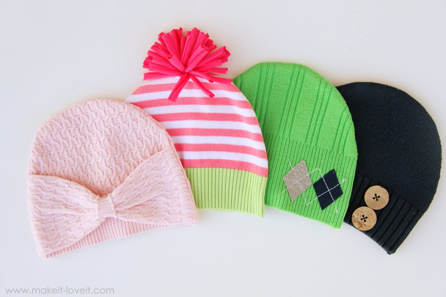 But here’s what I made.  Cutie-pie little baby hats……made from old sweaters.  If you’ve never tried it, the bottom rim of sweaters makes a perfect hat brim.  (Wanna see a really old tutorial of mine?  Go here.  I turned an old sweater of mine into a hat back when my 2 older kiddos were so itty bitty.  Wow, things have changed!)