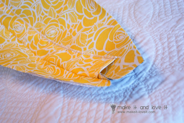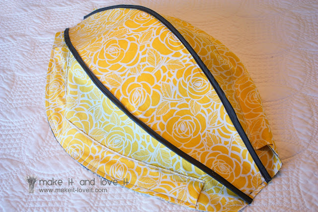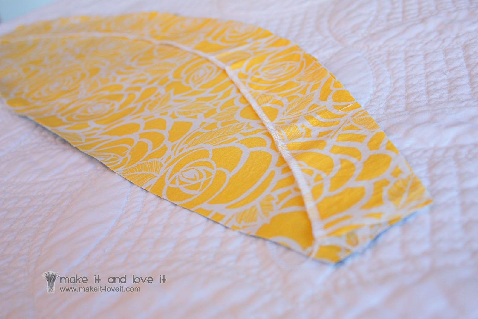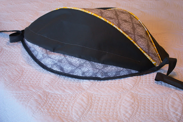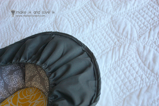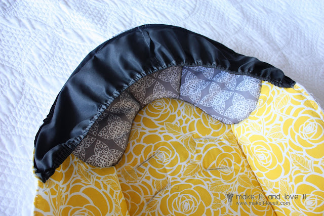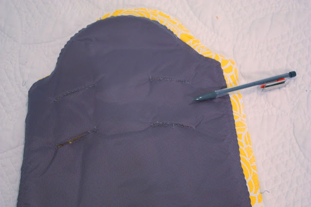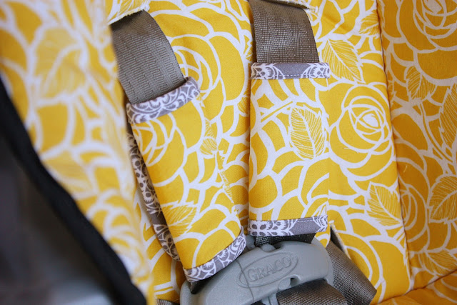 **You’ll see that the gray piece at the bottom (where the feet would go) didn’t make it to the final car seat cover.  I changed my mind at the end and swapped it for the yellow fabric.