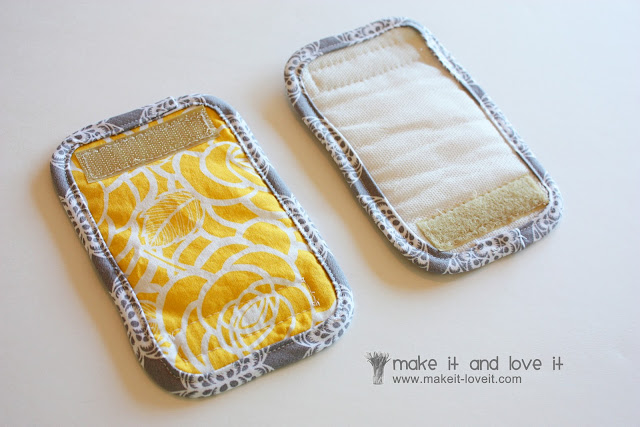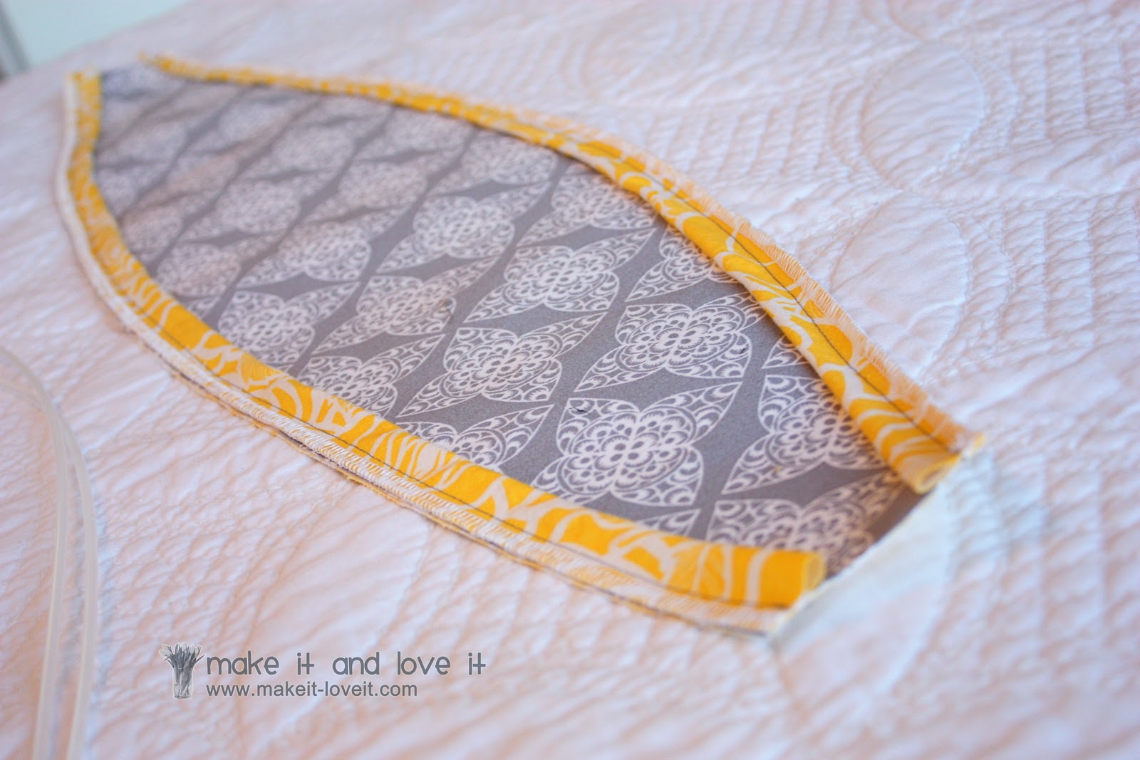 Then, I made my own bias tape (click here for help) and attached it to the raw edges of each shoulder cover.  And lastly, I attached the velcro to each strap……just like the original ones.