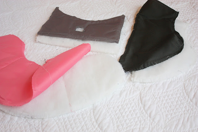 Then I placed each pattern piece with its appropriate batting piece, pinned them together with the fabric facing right side up, and zig-zagged around the entire piece.