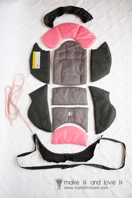 Disclaimer: Altering your car seat may void your car seat’s warranty.  Make It and Love It is not responsible for any decisions made regarding your own car seat or fabrics chosen.  I do, however, show how to use the exact same batting from the original seat and keep the same shape and dimensions, but just change out the top layer of fabric.  But the thickness of the fabric is the same…not changing the thickness of the cover at all.  However, in the event of an accident, your car seat may or may not be replaced with a brand new one.  So consider the risk of having to pay for a new one, if your seat was damaged in a way that your seat’s company would have been willing to replace it for free.  (I have heard of companies replacing the seat even though new covers were used, and other scenarios where they would not replace the seat.  So keep that in mind.)