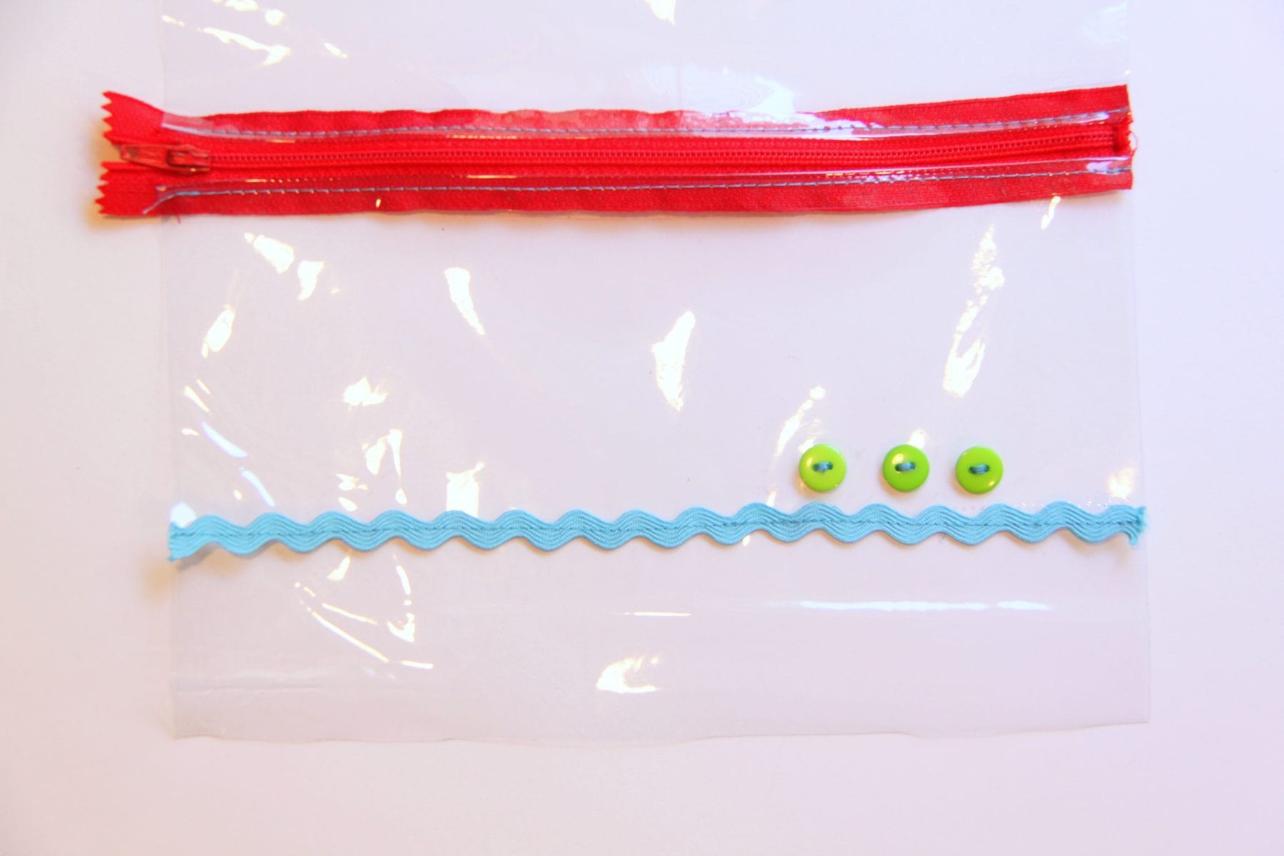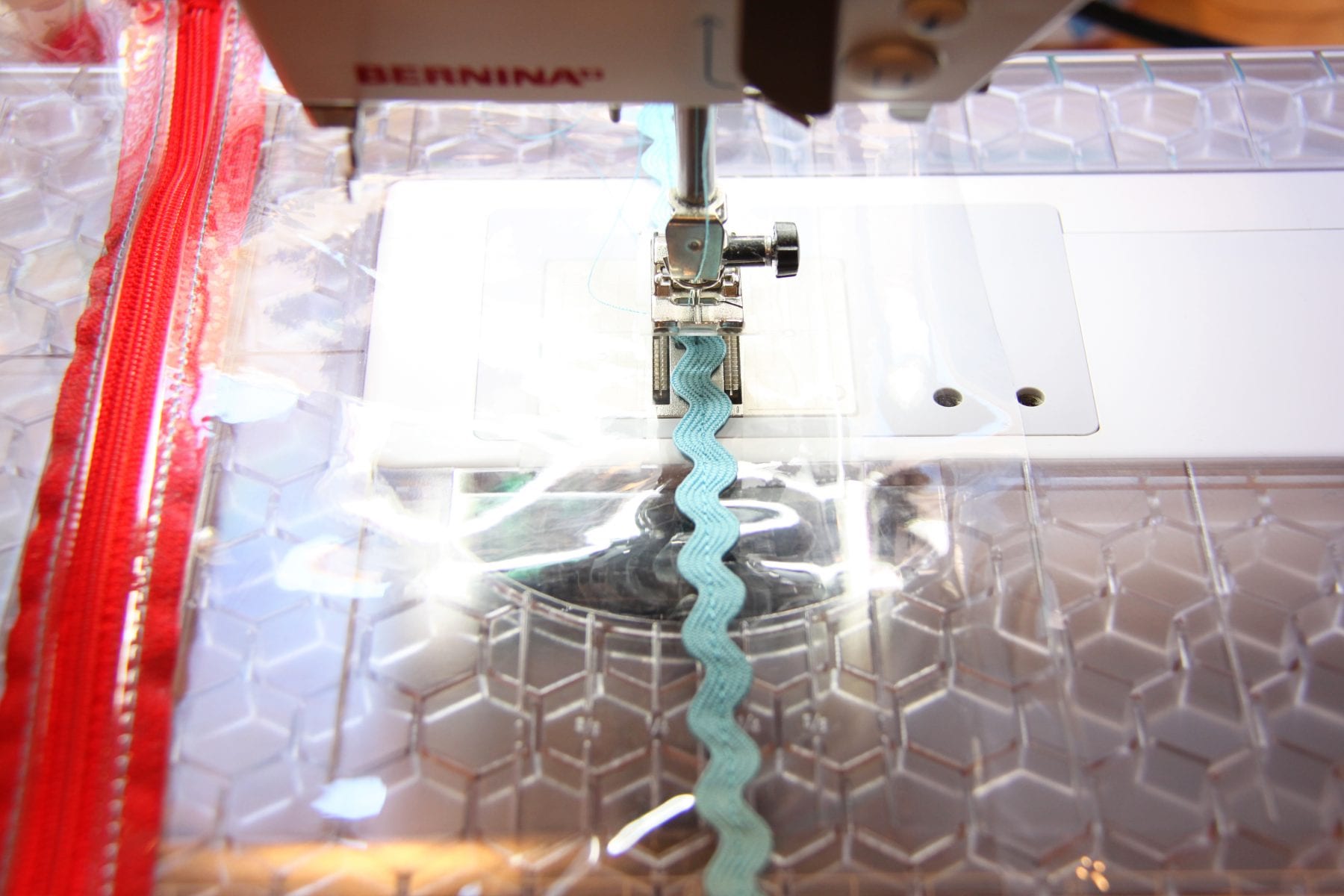 Then, before sewing the pouch together, I added some ric-rac to the front. And yep, the vinyl slid right along.