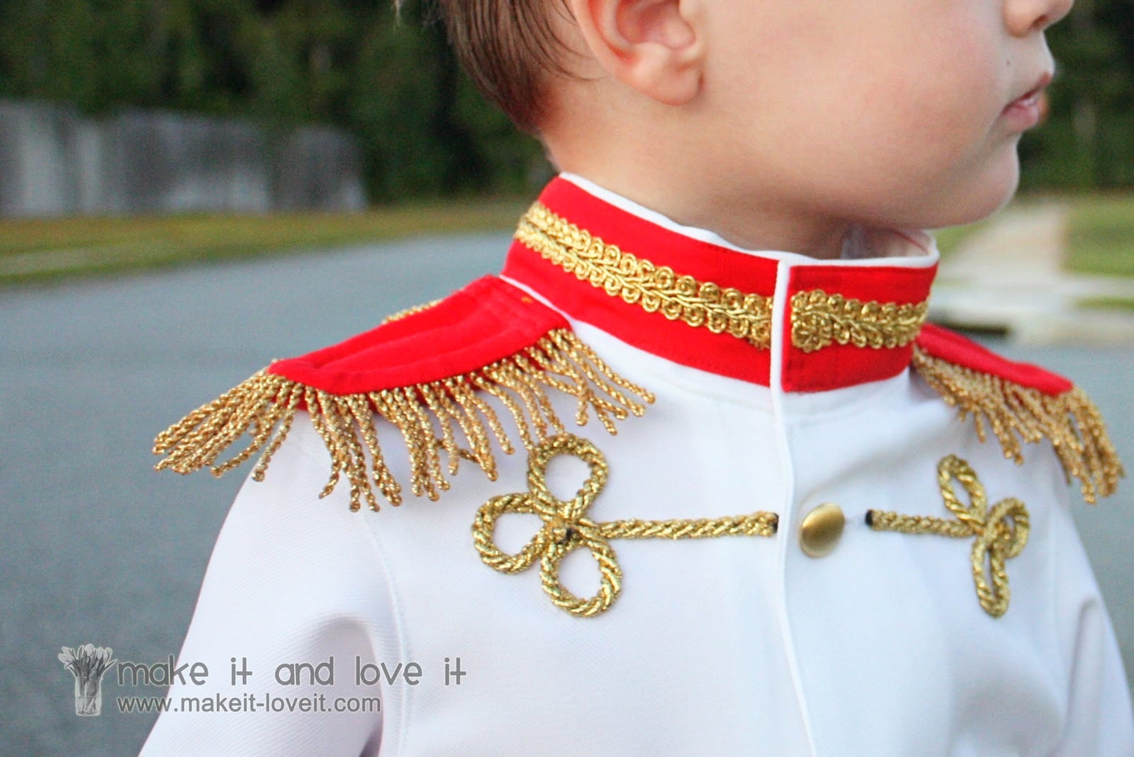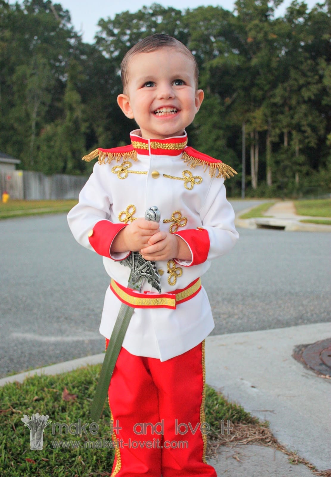 And haha, making this Prince Charming costume had me giggling the whole time. I don’t know, there was something about making a suit for this tiny little bubble belly boy. Every time I finished a detail, I laughed. And to watch him slice the air with his sword just cracked us up every time. Prince Charming found here.