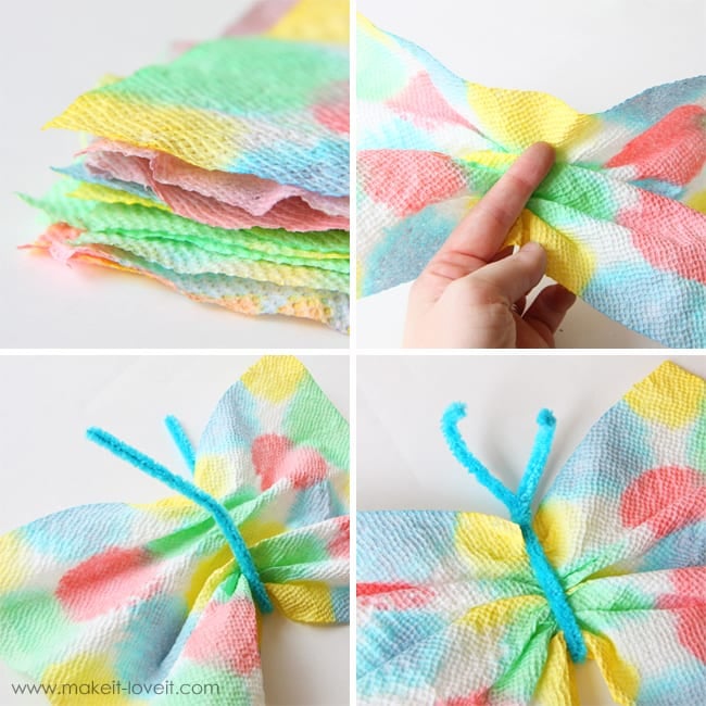 Once each paper towel is dry…….gather along the center of each paper towel, wrap a pipe cleaner around the center, twist it off, even out the wings, flatten the body, and then curl the antenna’s.