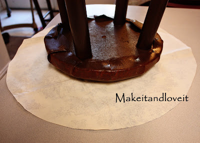 Then I cut circle pieces of upholstery fabric, a few inches larger than the stool tops ….