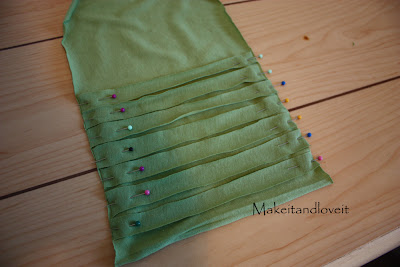 Then, starting an inch and a half from the end of your front piece (my end rolled a bit, so it’s hard to tell), pin 7 of your strips to the scarf.